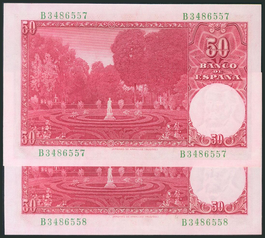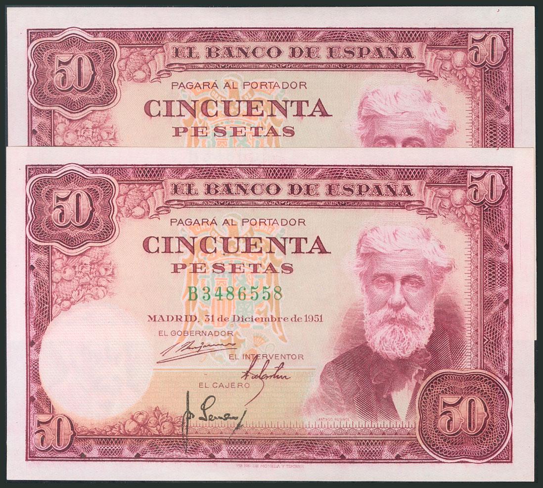 50 Pesetas. 31 de Diciembre de 1951. Pareja correlativa. Serie B. (Edifil 2017: 462a). Conserva el apresto original. EBC+.