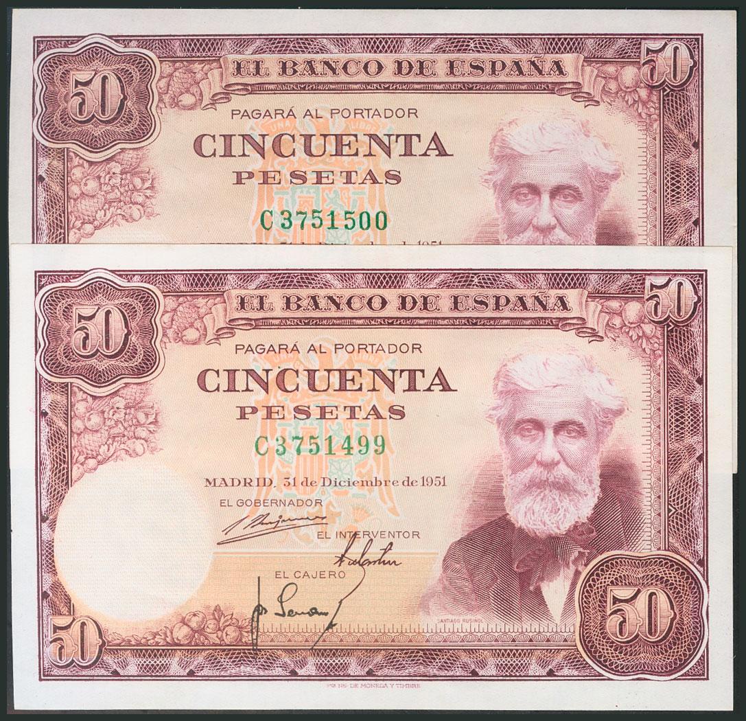 50 Pesetas. 31 de Diciembre de 1951. Pareja correlativa. Serie C. (Edifil 2017: 462a). EBC+.