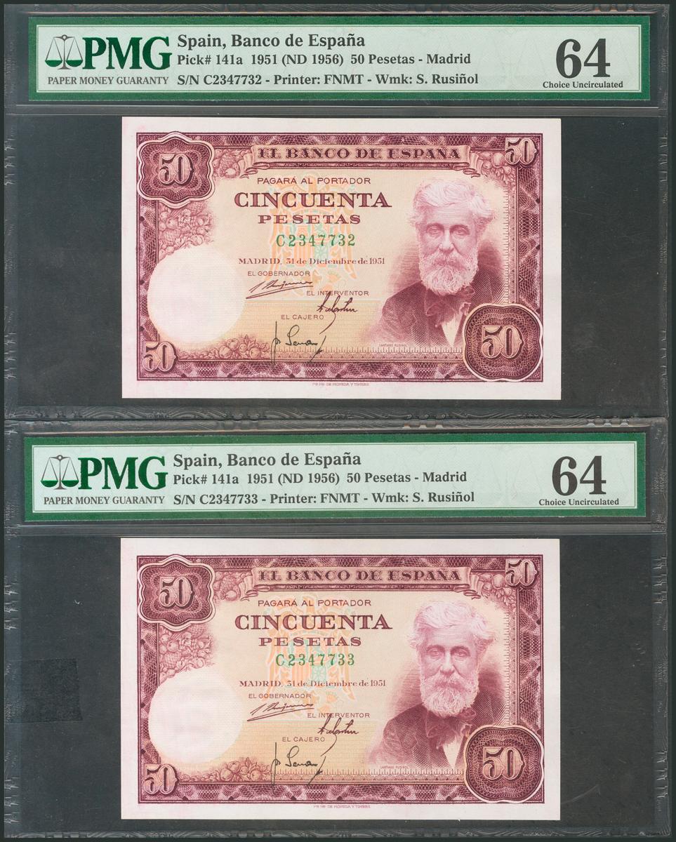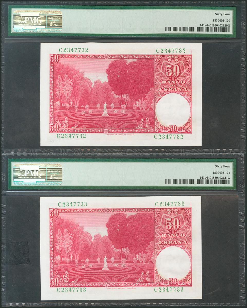 50 Pesetas. 31 de Diciembre de 1951. Pareja correlativa. Serie C, última serie emitida. (Edifil 2017: 462a). Encapsulados PMG64, ambos. SC.