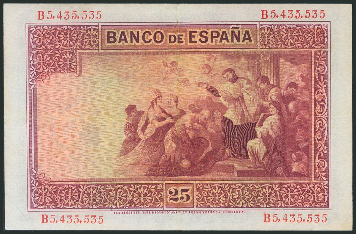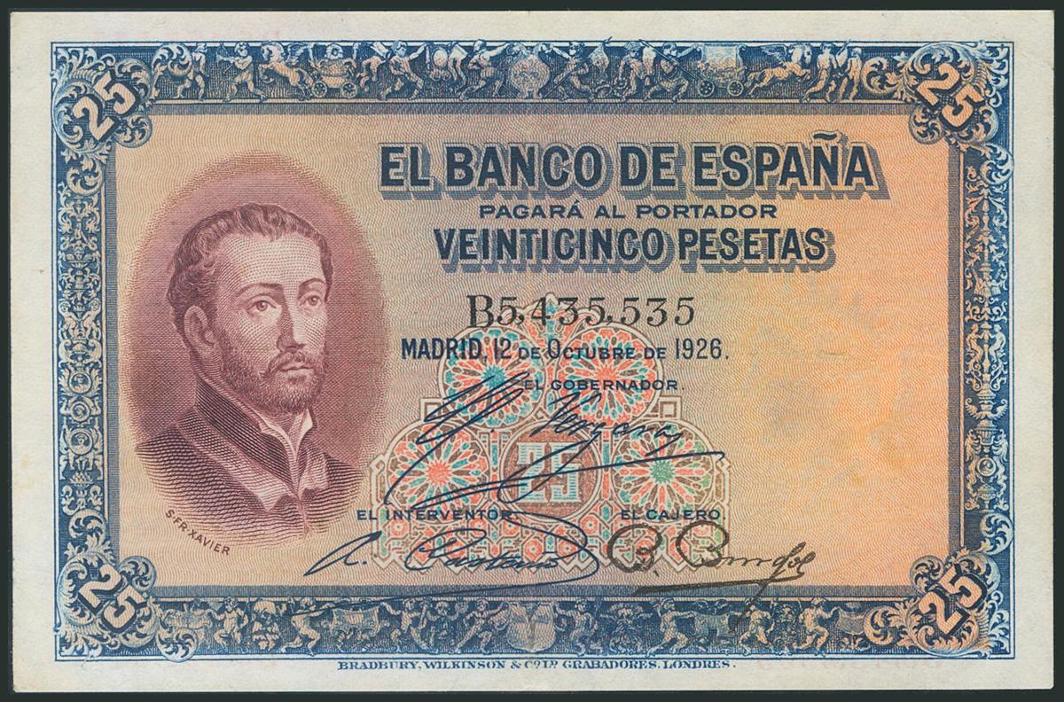 25 Pesetas. 12 de Octubre de 1926. Serie B. (Edifil 2017: 325a). Expertamente reparado en el pliegue central y doblez horizontal planchado, dándole un aspecto espectacular y muy superior a la conservación real, con un apresto muy plano y con falta de viveza. MBC, en su estado original.