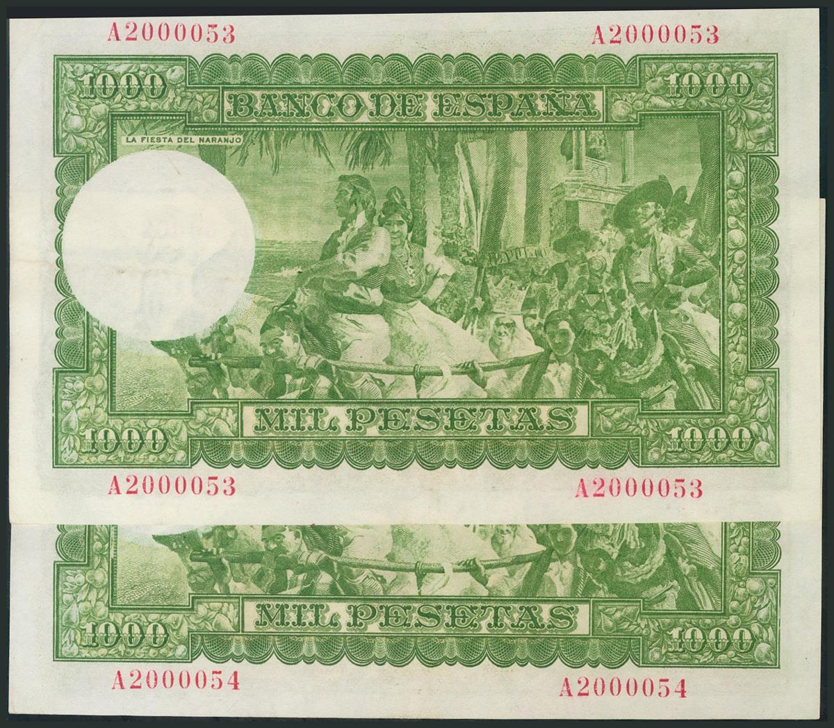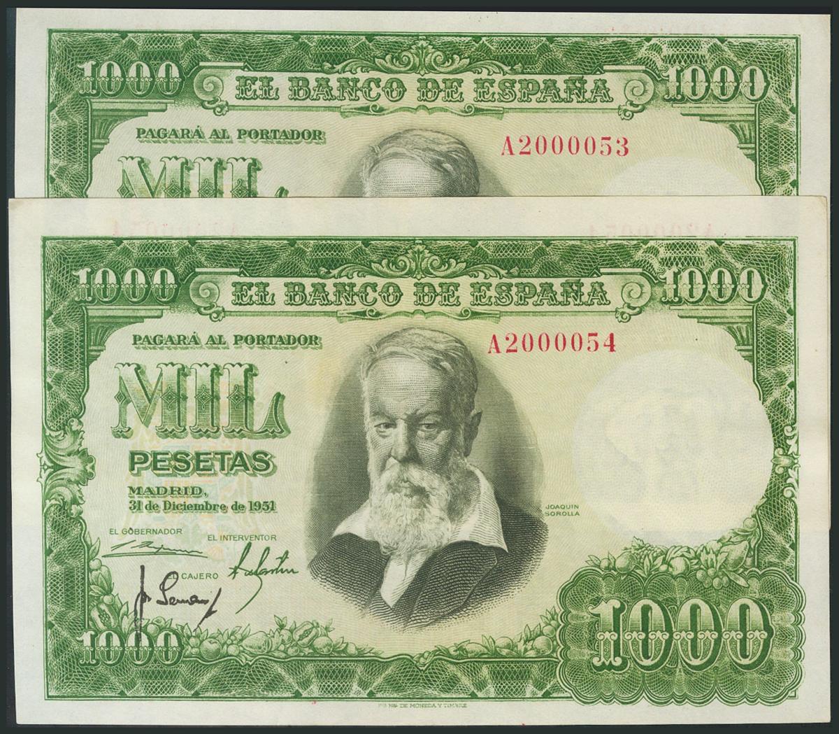1000 Pesetas. 31 de Diciembre de 1951. Pareja correlativa. Serie A. (Edifil 2017: 463a). Conserva todo su apresto original. EBC+.