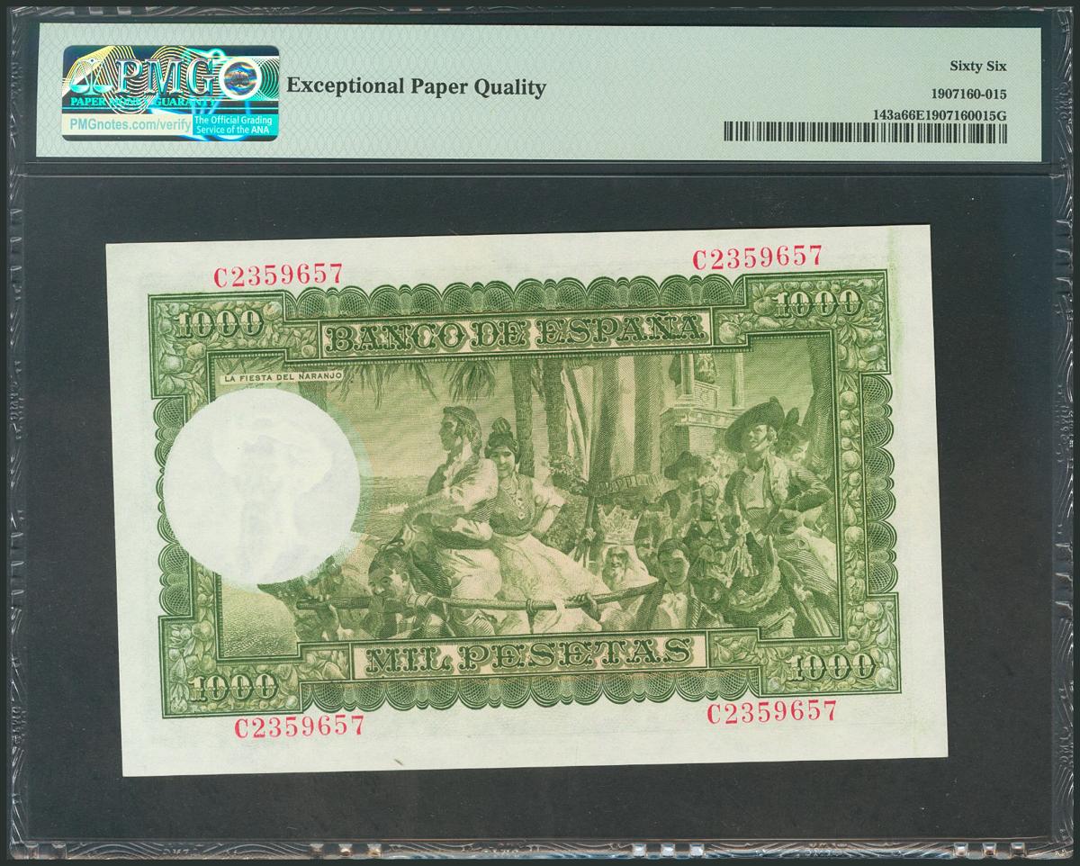 1000 Pesetas. 31 de Diciembre de 1951. Serie C, última serie emitida. (Edifil 2017: 463a). Apresto original y excepcional calidad. SC+. Encapsulado PMG66EPQ.