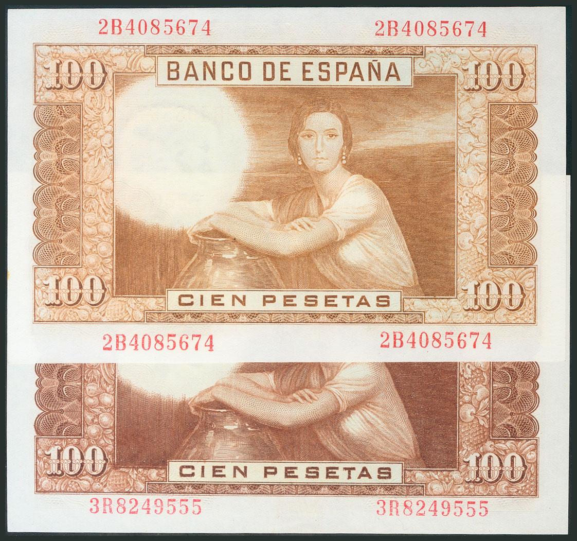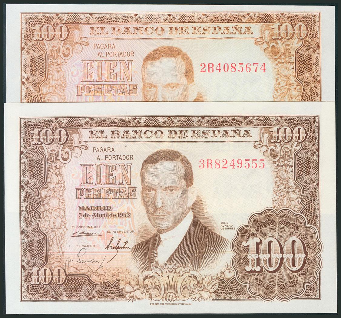 Conjunto de 2 billetes de 100 Pesetas emitidos el 7 de Abril de 1953 con las series 2B y 3R, respectivamente (Edifil 2017: 464c). Enorme contraste de las tonalidades de color utilizadas en las diferentes etapas de la impresión. SC/SC-.