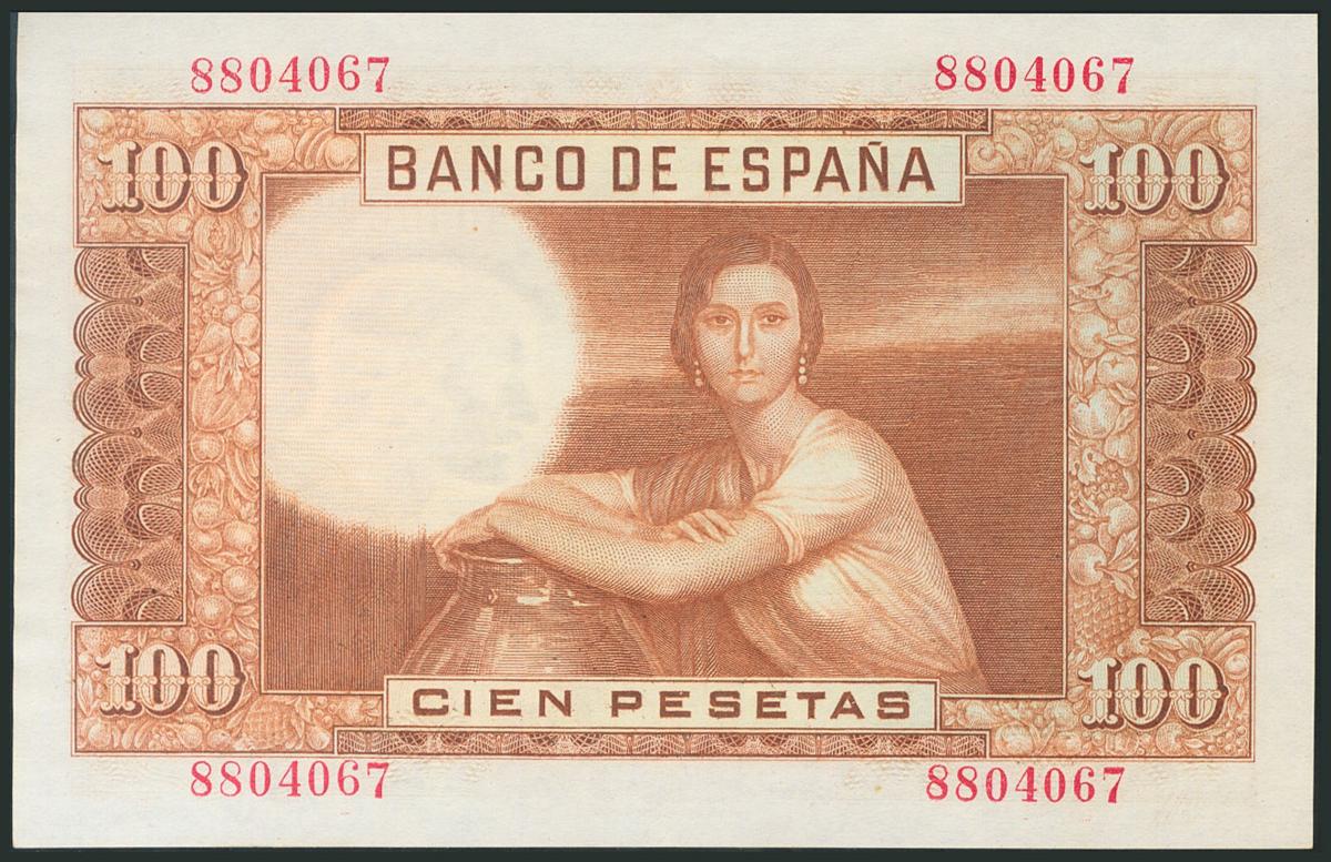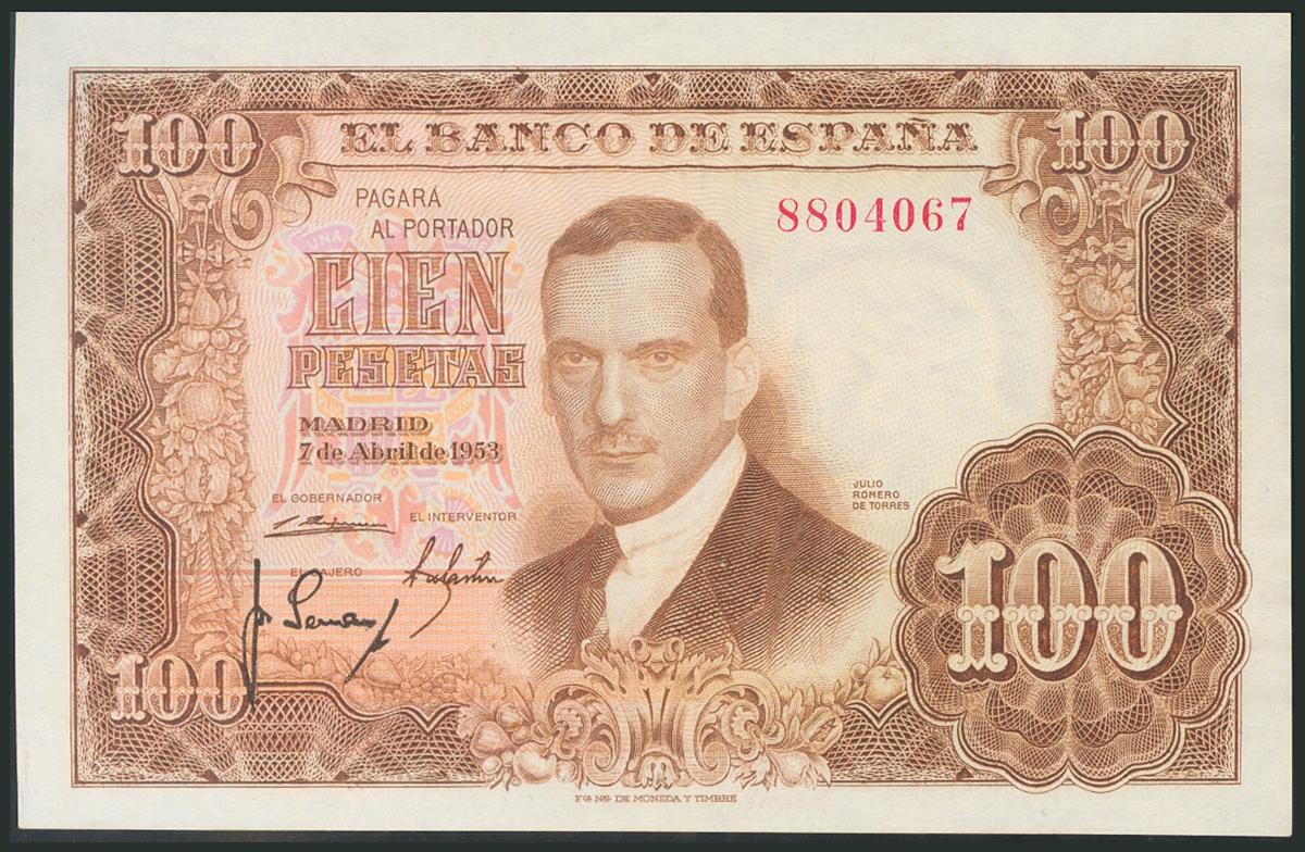 100 Pesetas. 7 de Abril de 1953. Sin serie. (Edifil 2017: 464). Conserva gran parte del apresto original. EBC.