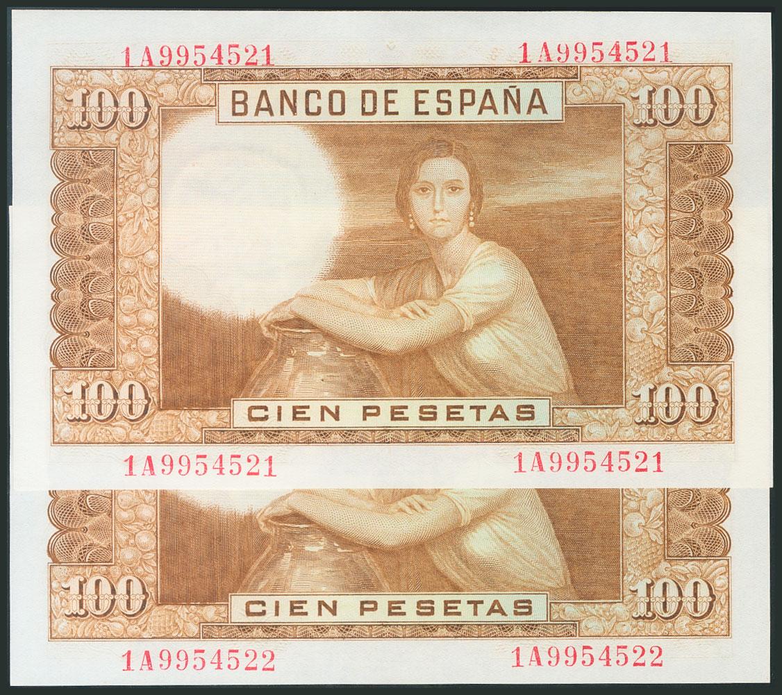 100 Pesetas. 7 de Abril de 1953. Pareja correlativa. Serie 1A. (Edifil 2017: 464c). SC-.