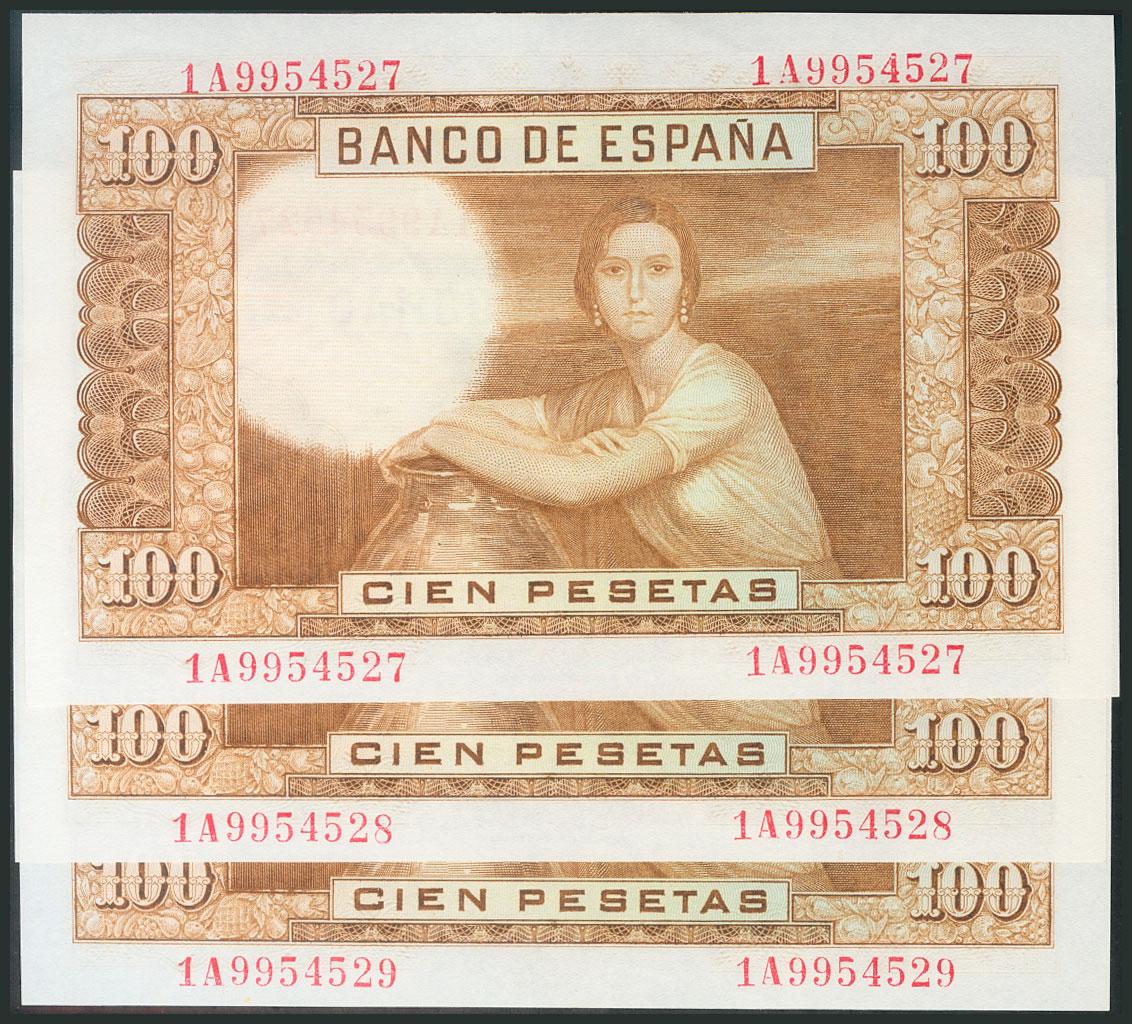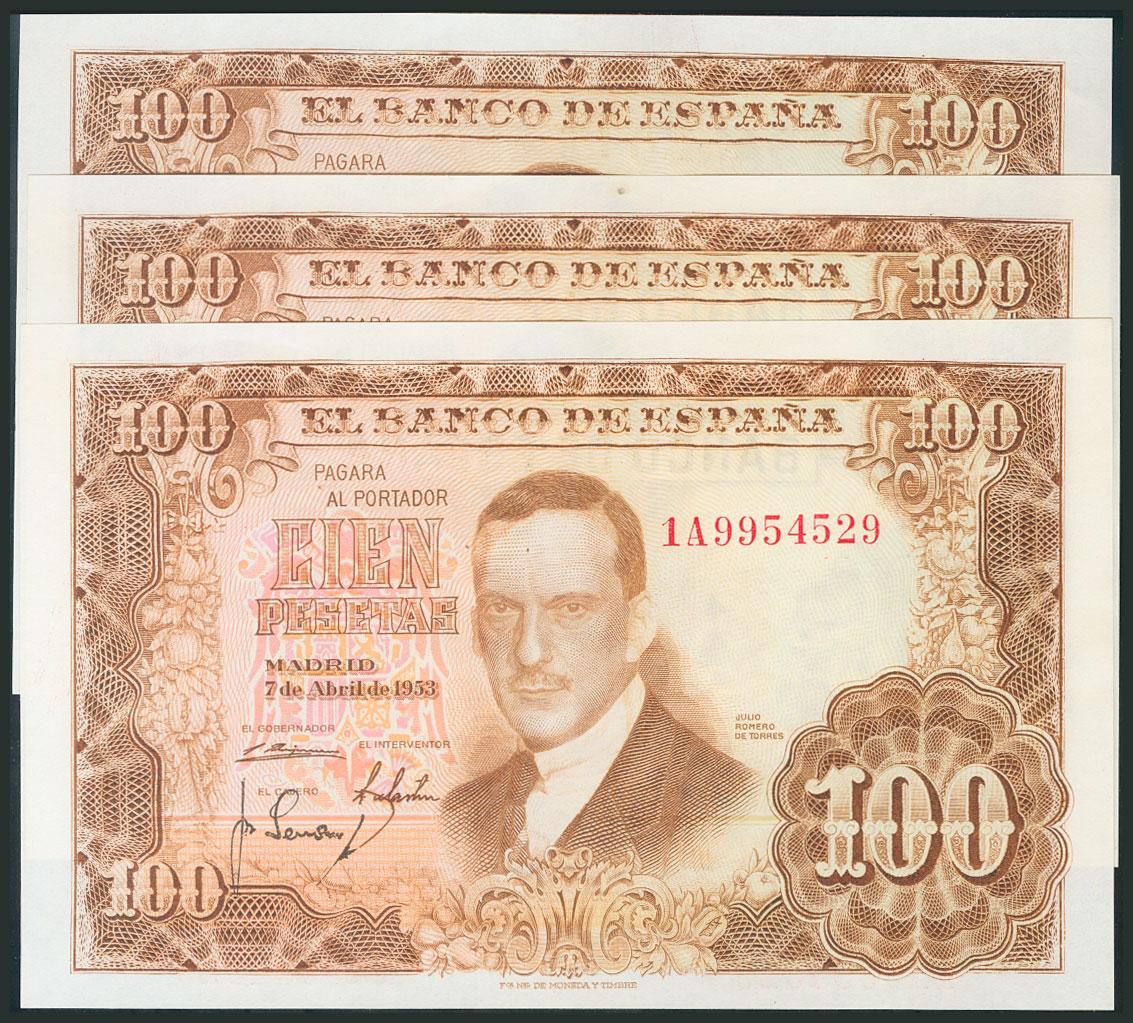 100 Pesetas. 7 de Abril de 1953. Trío correlativo. Serie 1A. (Edifil 2017: 464c). SC-.