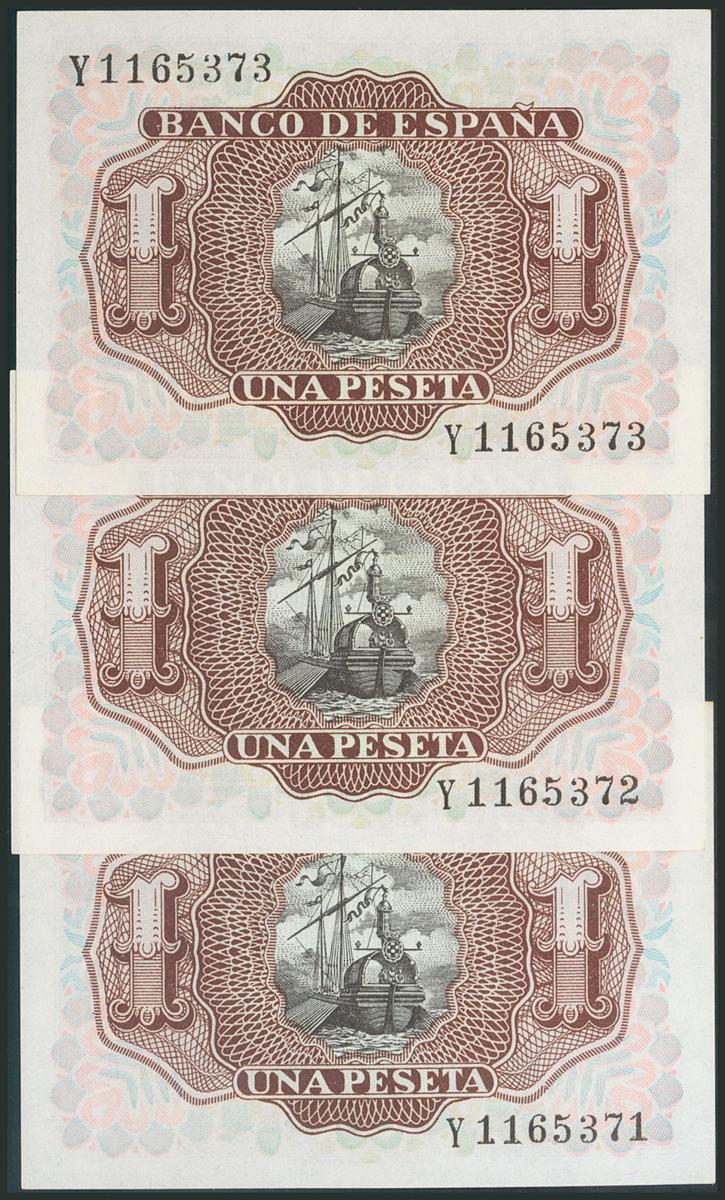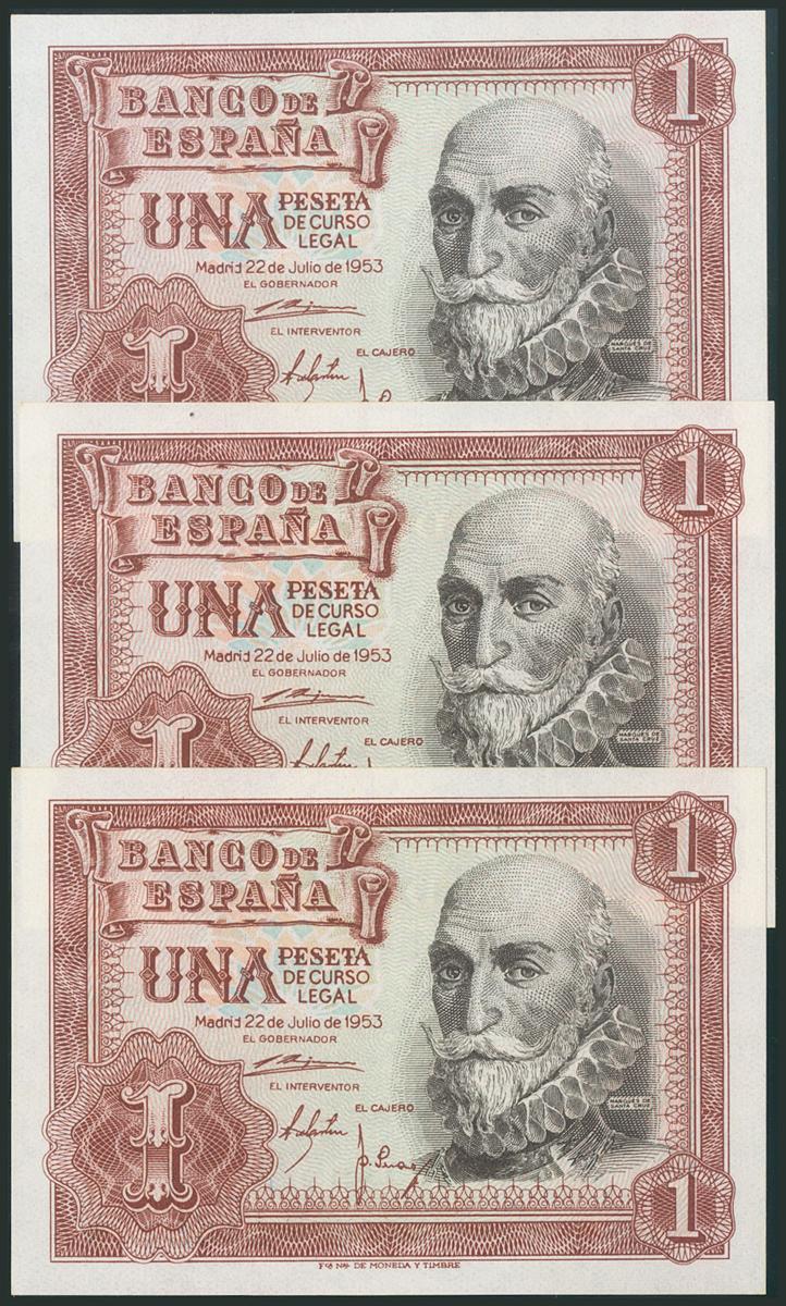 1 Peseta. 22 de Julio de 1953. Trío correlativo. Serie Y. (Edifil 2017: 465a). SC/EBC+.