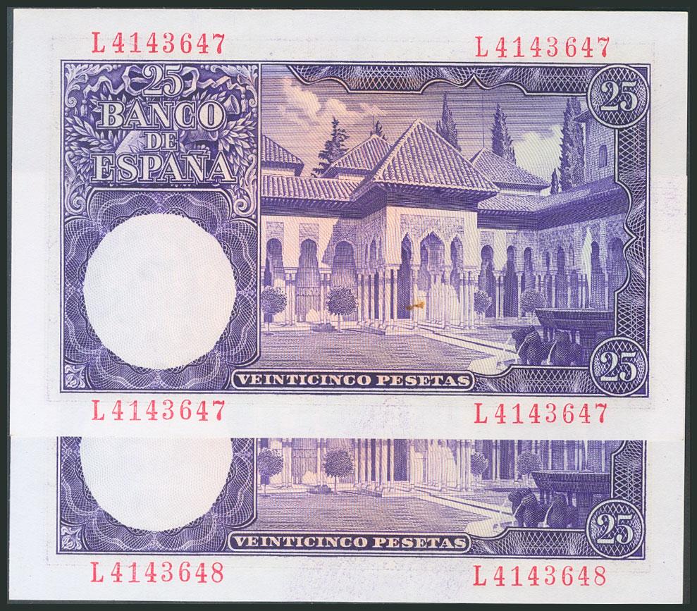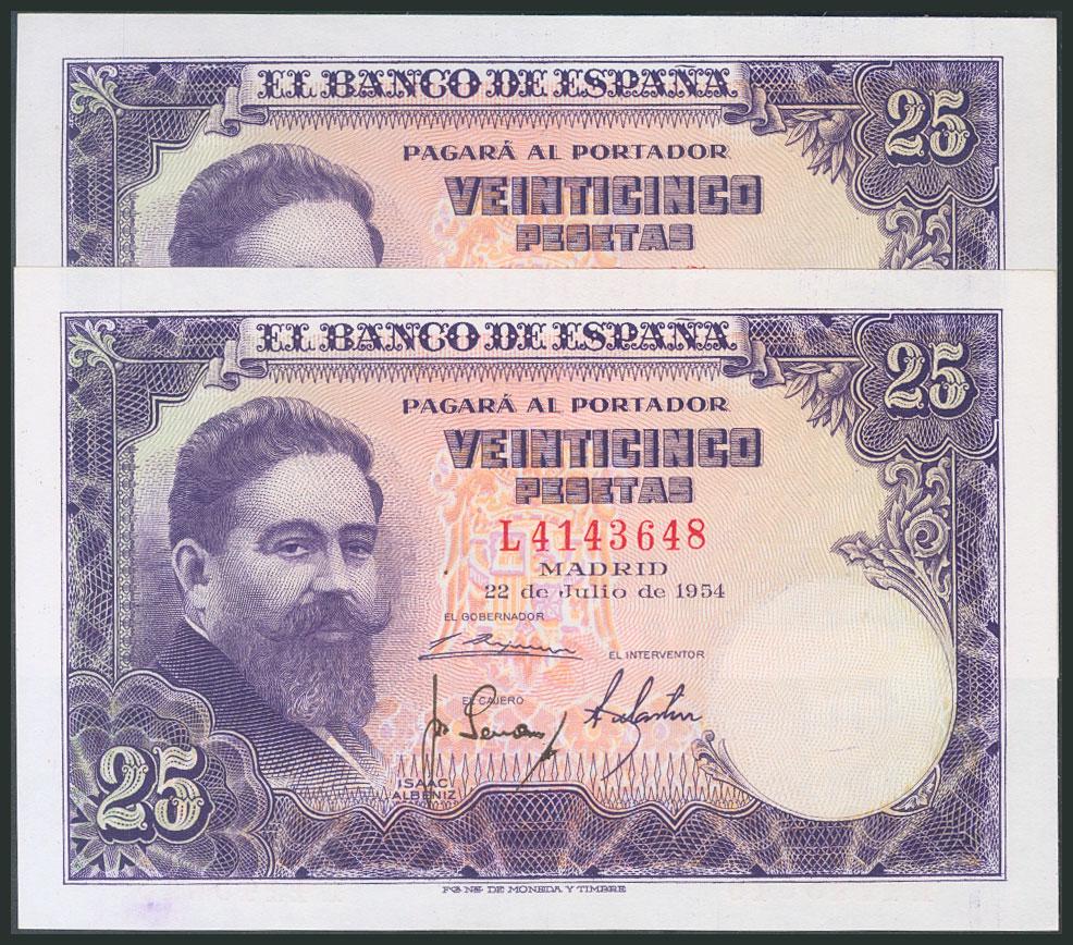 25 Pesetas. 22 de Julio de 1954. Pareja correlativa. Serie L. (Edifil 2017: 467a). Un billete punto de óxido. SC-.