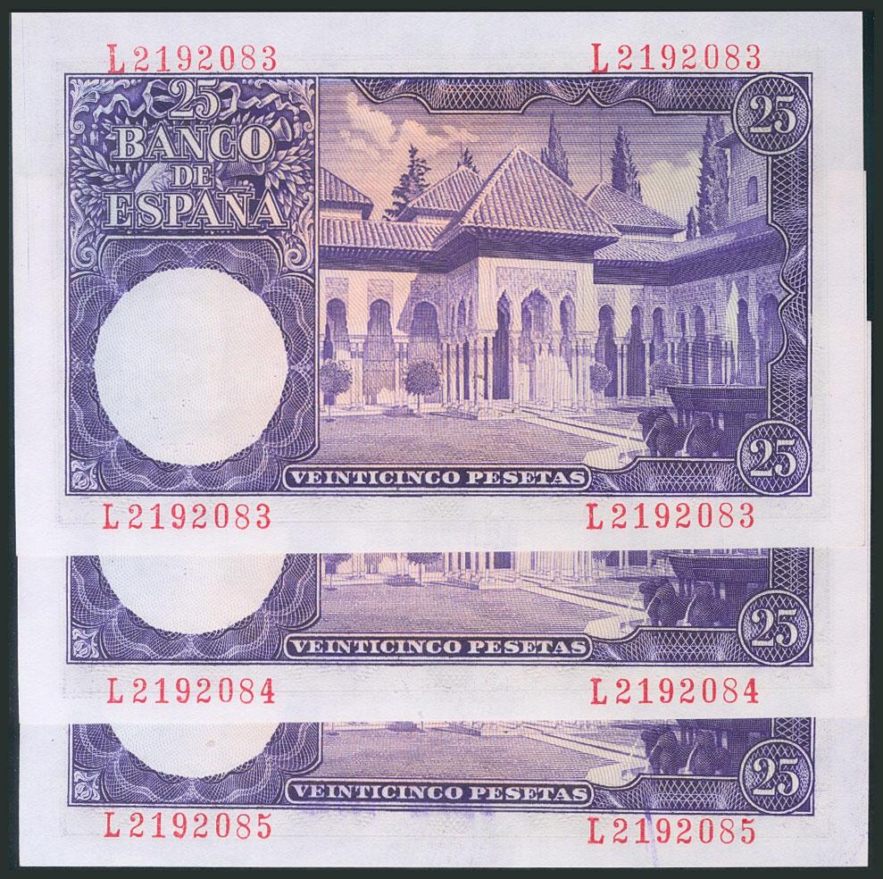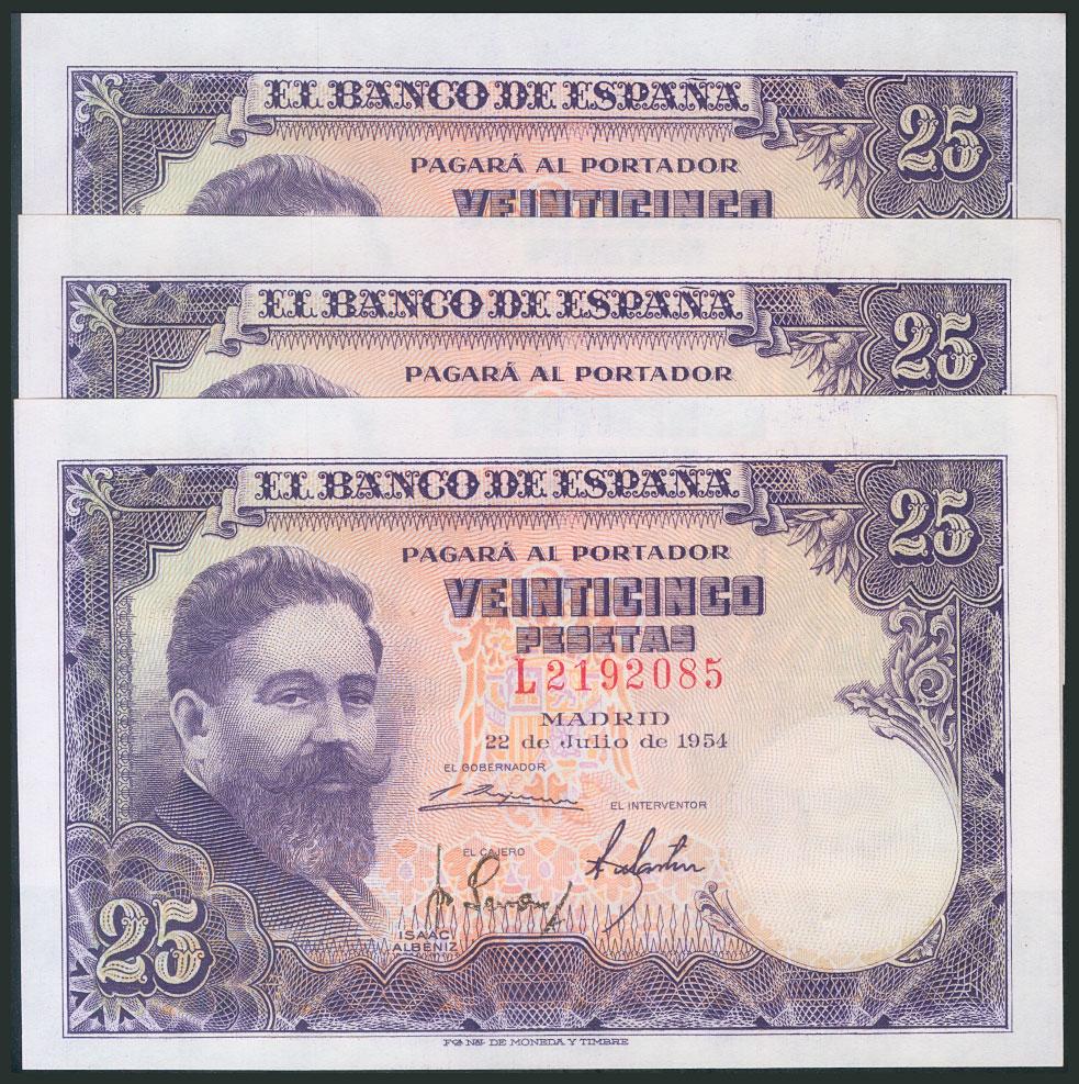 25 Pesetas. 22 de Julio de 1954. Trío correlativo. Serie L. (Edifil 2017: 467a). SC.