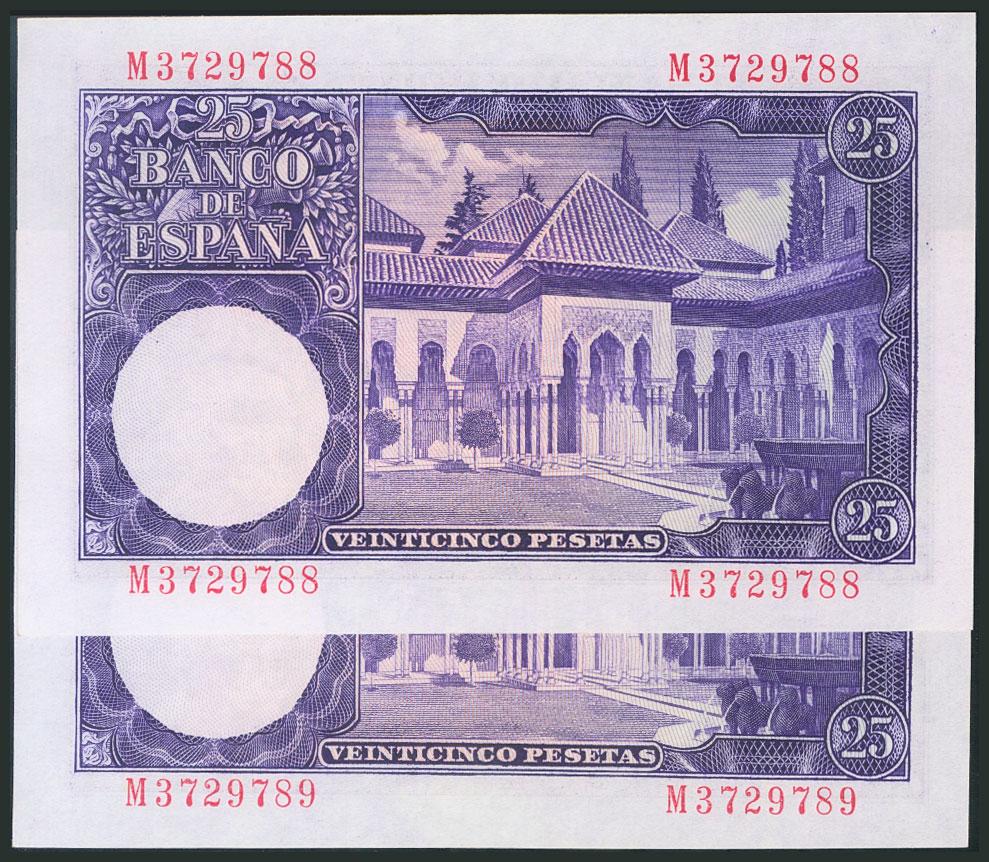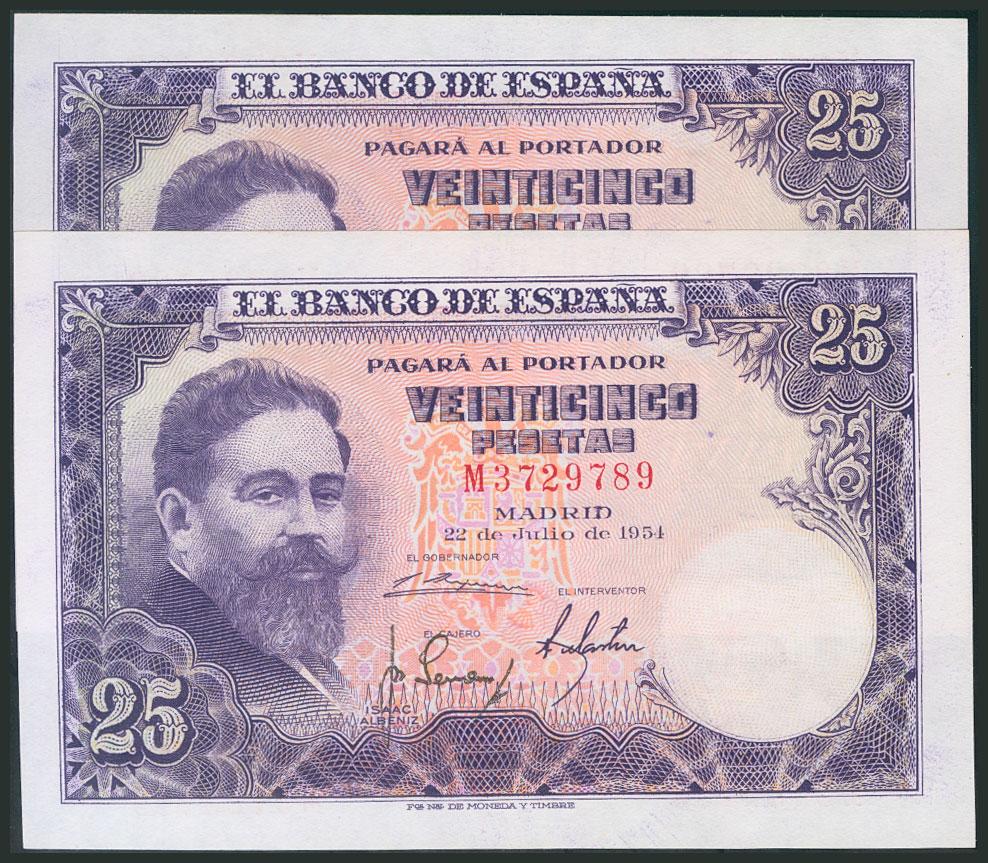 25 Pesetas. 22 de Julio de 1954. Pareja correlativa. Serie M. (Edifil 2017: 467a). SC.