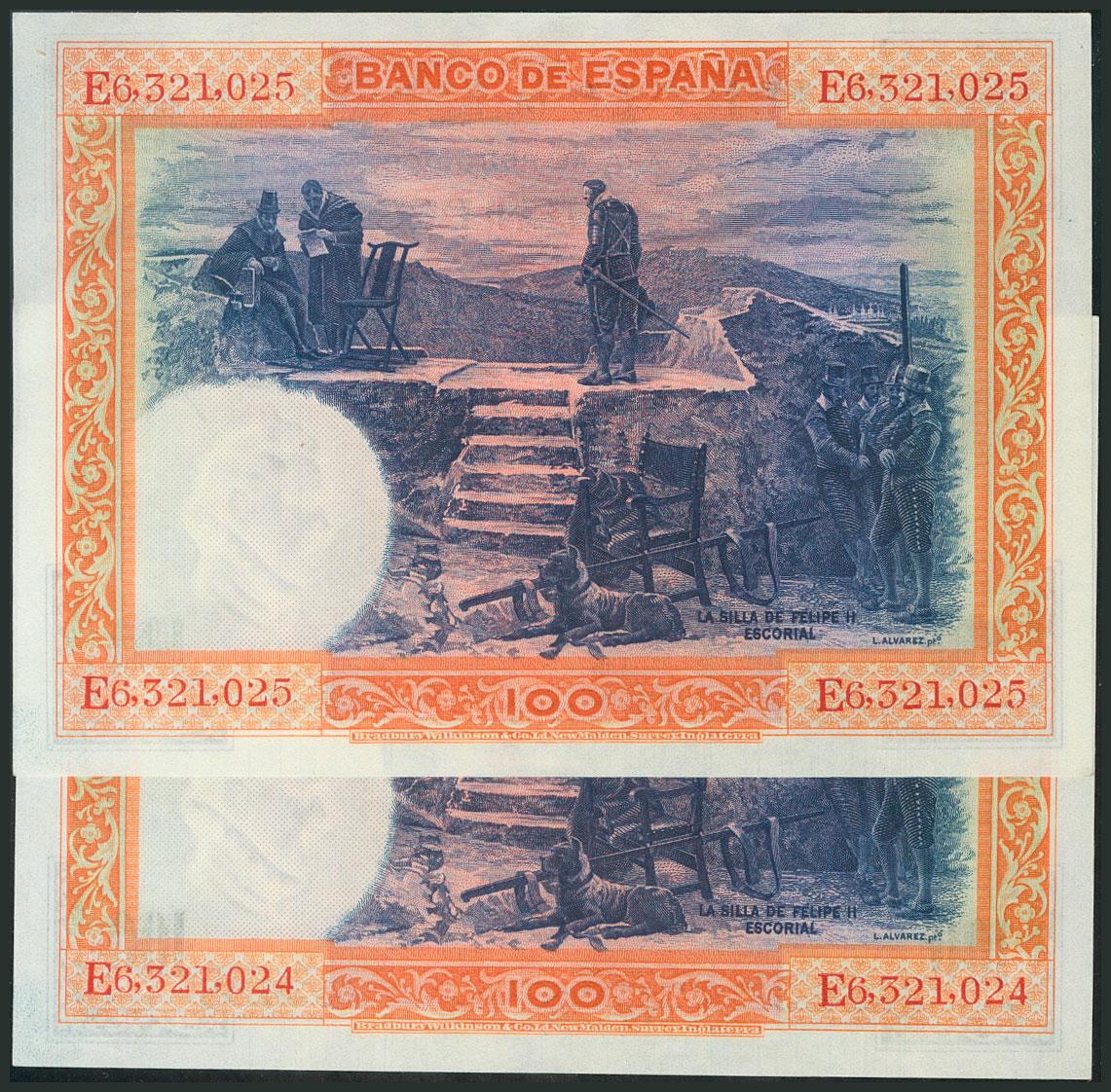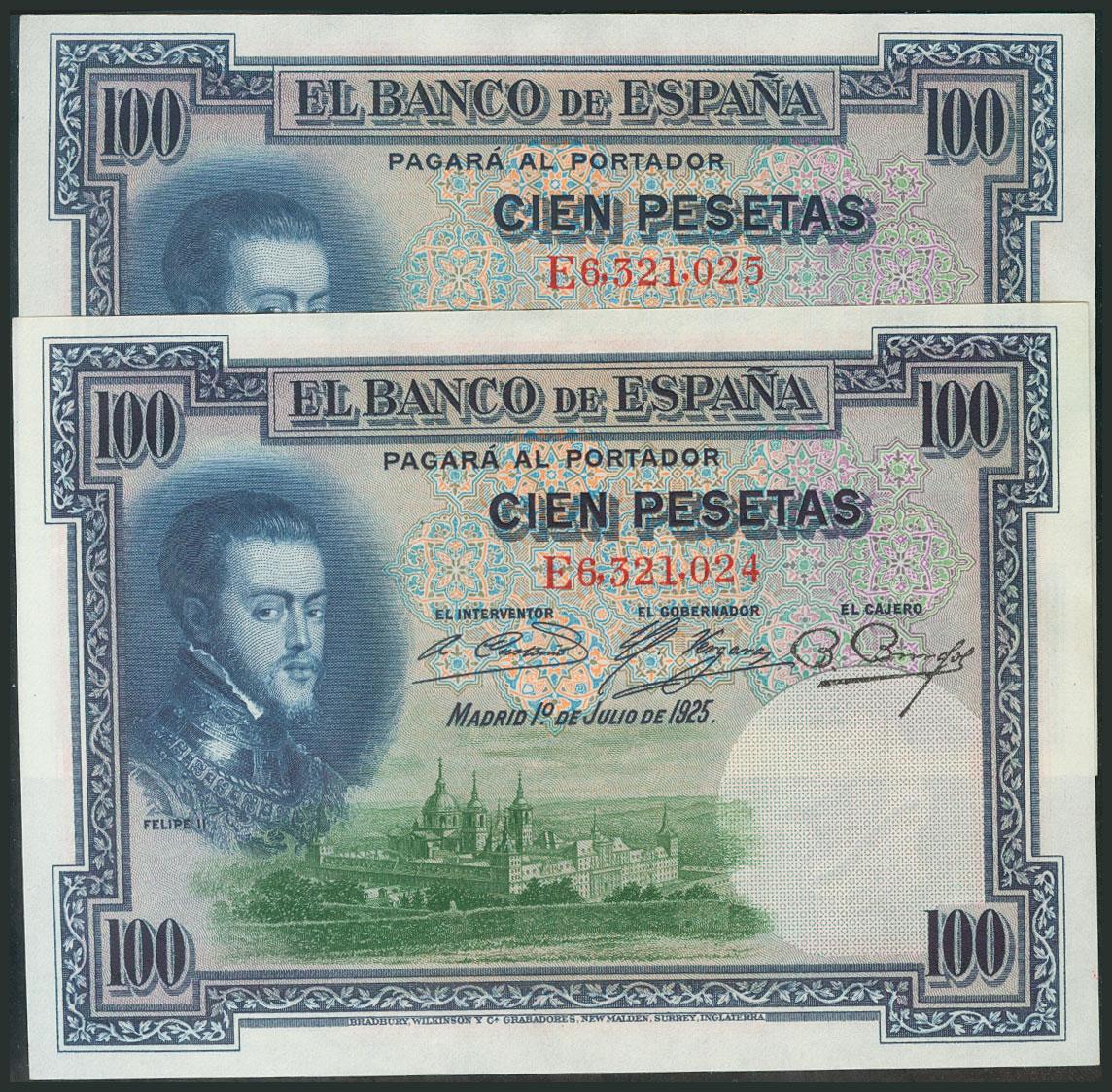 100 Pesetas. 1 de Julio de 1925. Pareja correlativa. Serie E. (Edifil 2017: 350). SC.