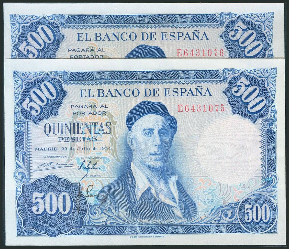 500 Pesetas. 22 de Julio de 1954. Pareja correlativa. Serie E. (Edifil 2017: 468b). Apresto original. SC/SC-.