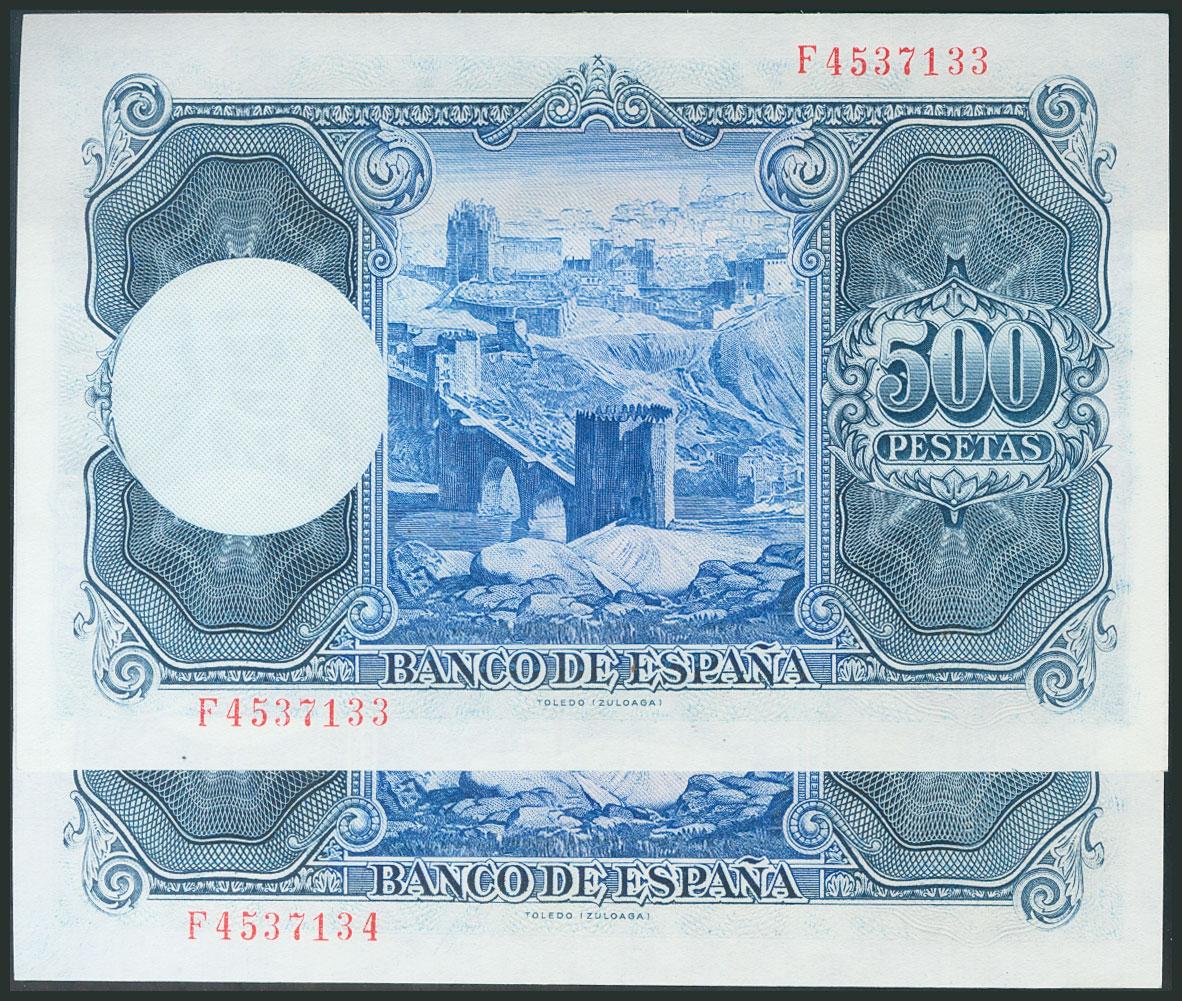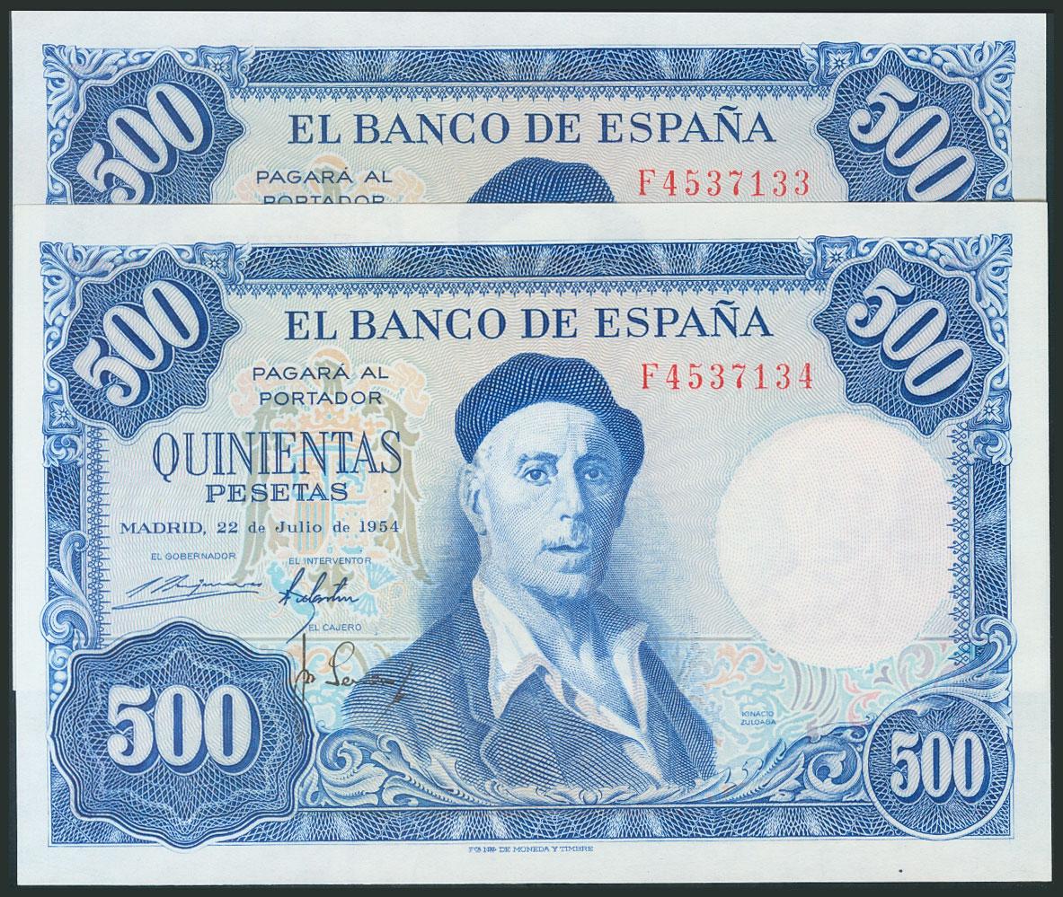 500 Pesetas. 22 de Julio de 1954. Pareja correlativa. Serie F. (Edifil 2017: 468b). Apresto original. SC.