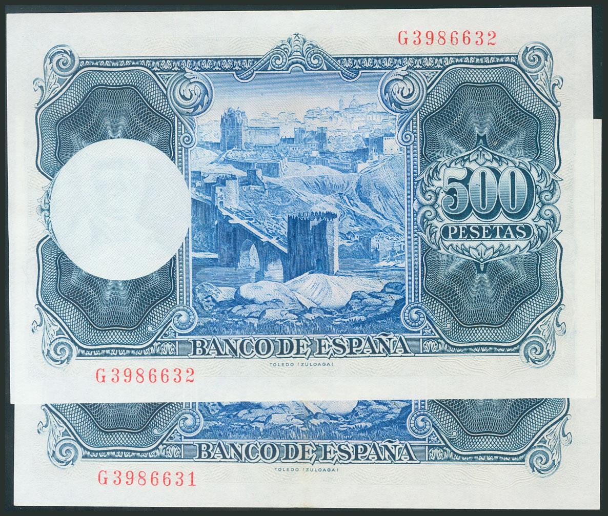 500 Pesetas. 22 de Julio de 1954. Pareja correlativa. Serie G. (Edifil 2017: 468b). Conserva gran parte del apresto original. EBC.