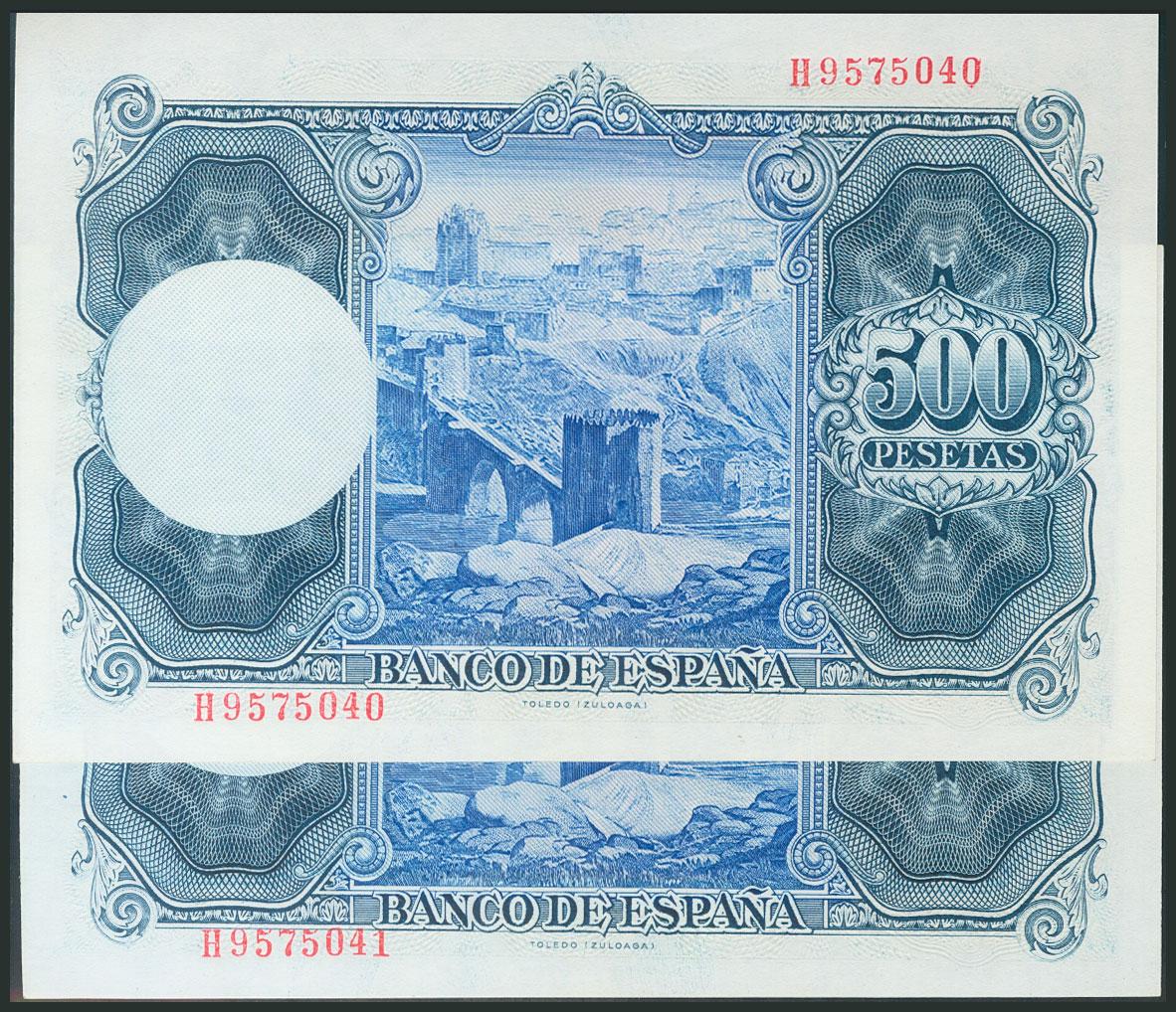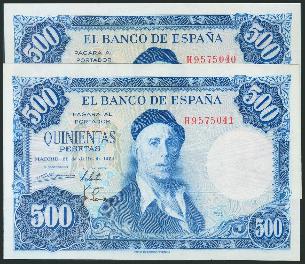 500 Pesetas. 22 de Julio de 1954. Pareja correlativa. Serie H. (Edifil 2017: 468b). Apresto original. SC/SC-.