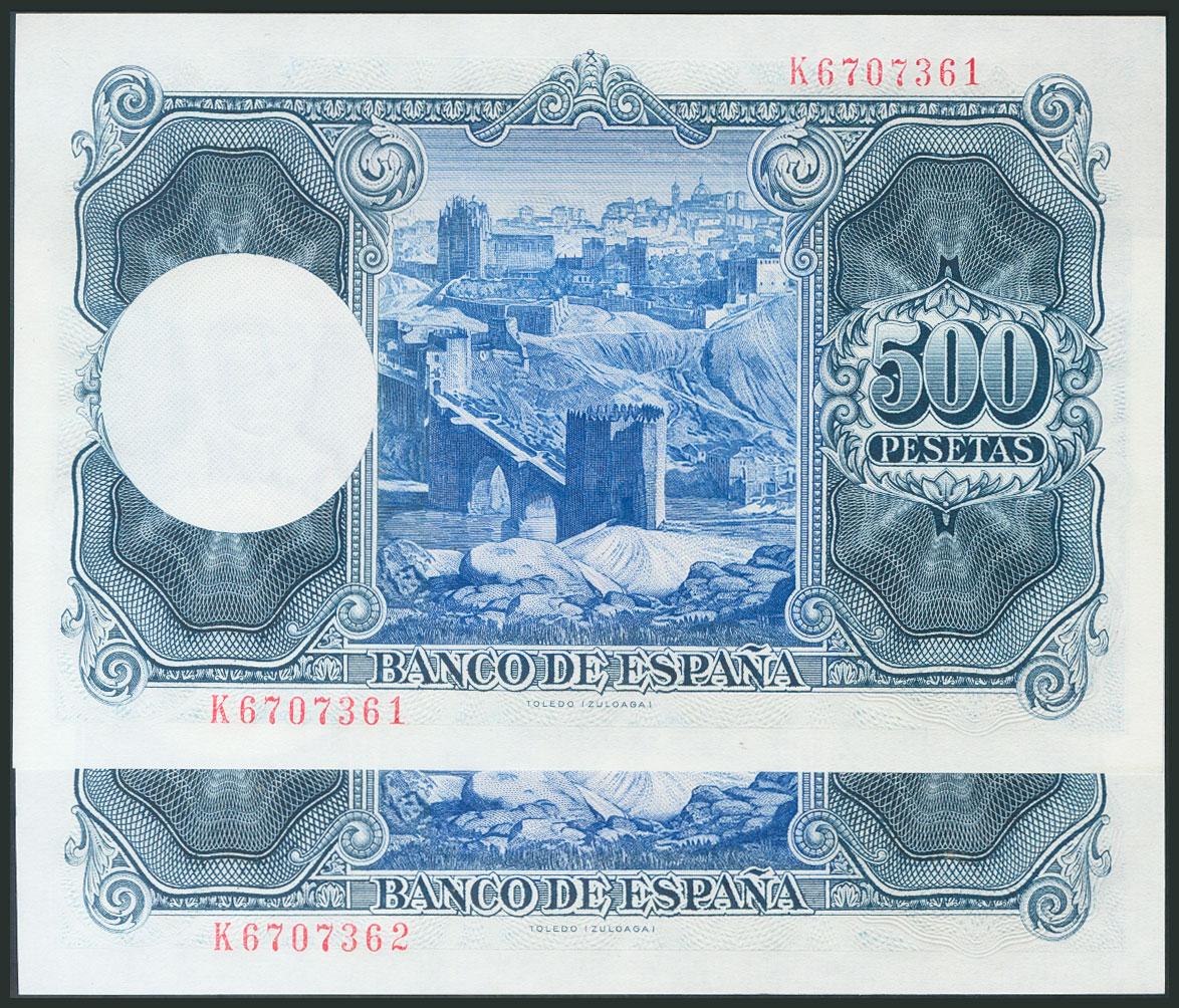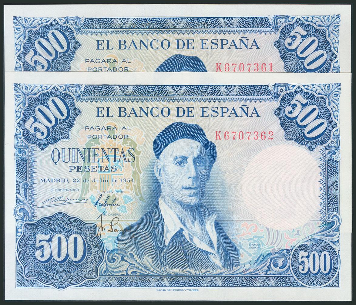 500 Pesetas. 22 de Julio de 1954. Pareja correlativa. Serie K. (Edifil 2017: 468b). Apresto original. SC.