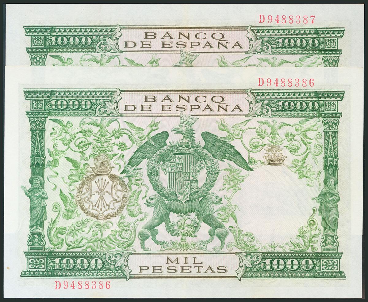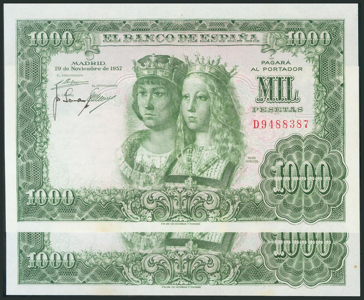 1000 Pesetas. 29 de Noviembre de 1957. Pareja correlativa. Serie D. (Edifil 2017: 469b). EBC.