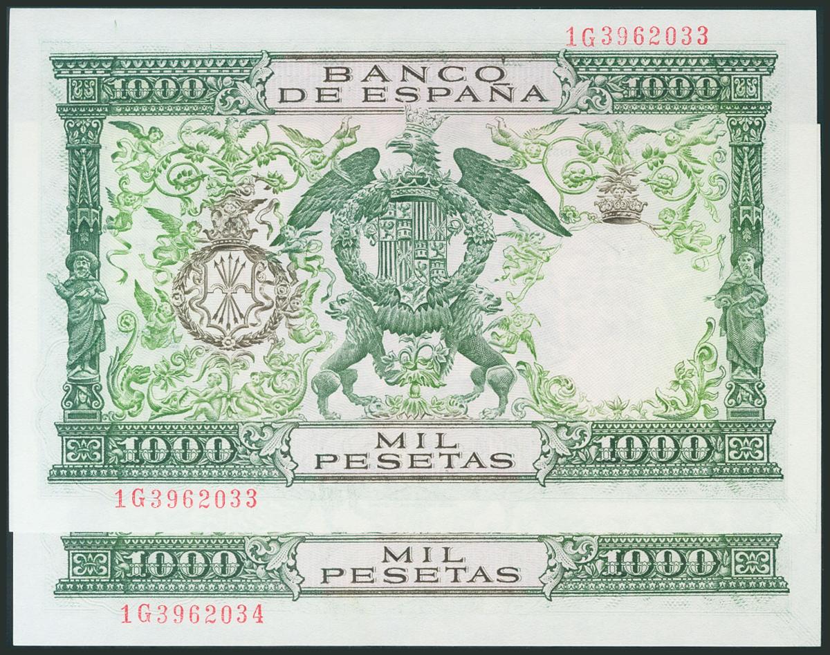 1000 Pesetas. 29 de Noviembre de 1957. Pareja correlativa. Serie 1G. (Edifil 2017: 469b). SC.