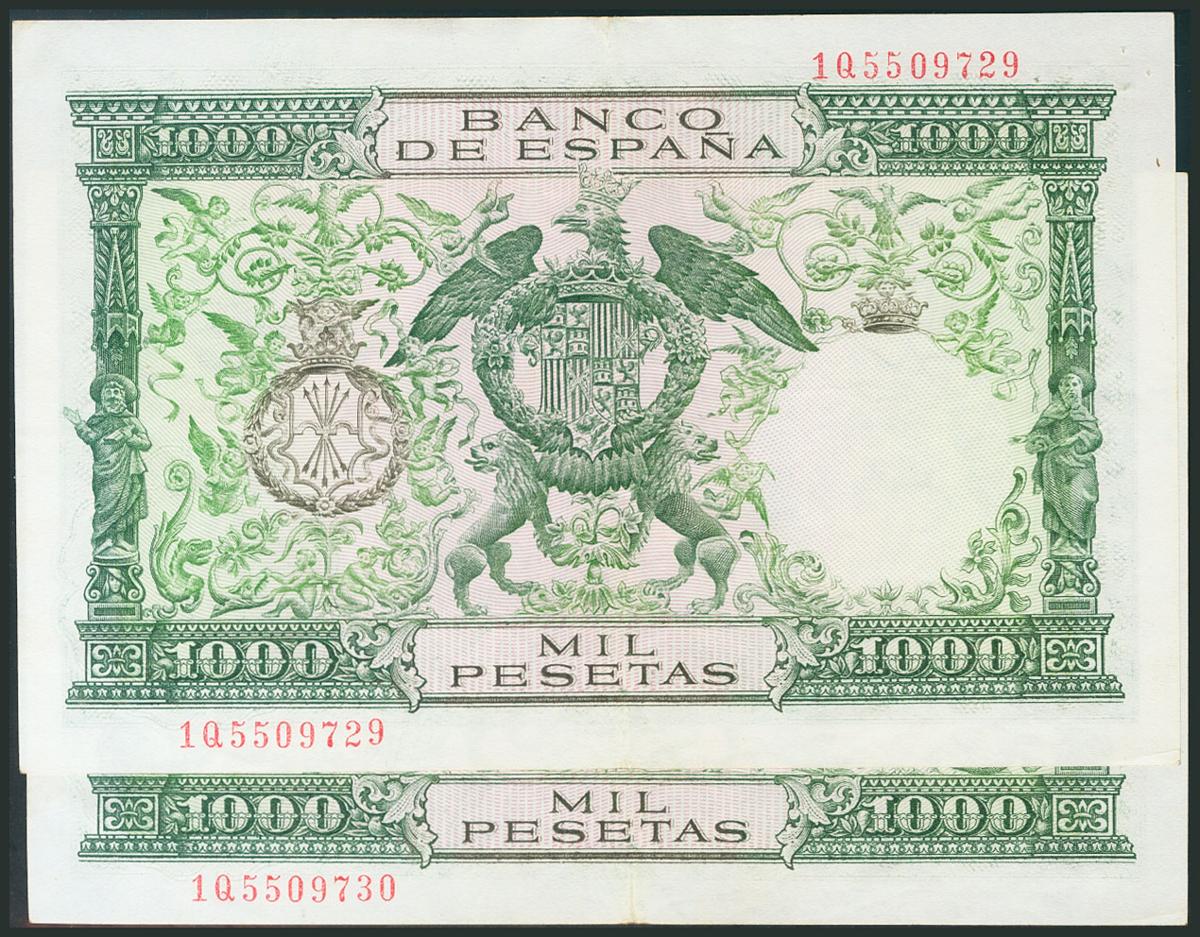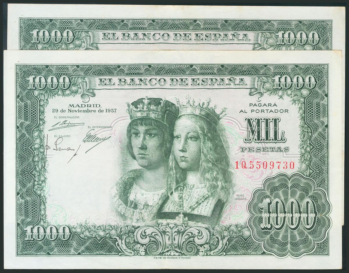 1000 Pesetas. 29 de Noviembre de 1957. Pareja correlativa. Serie 1Q. (Edifil 2017: 469b). MBC+.