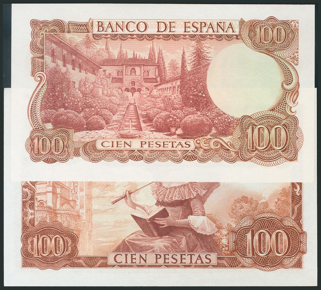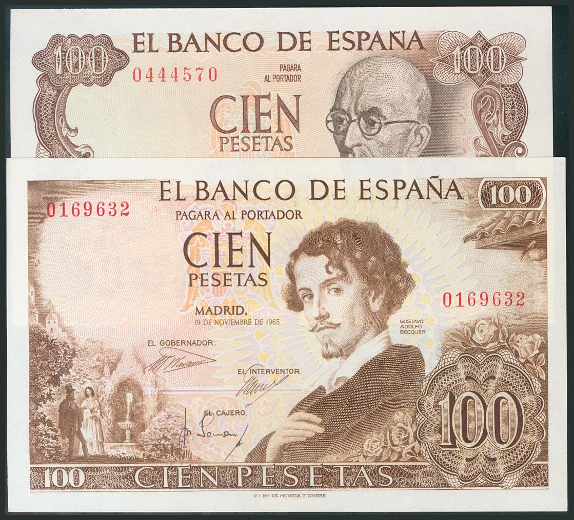 Conjunto de 2 billetes del Banco de España de 100 Pesetas emitidos el 19 de Noviembre de 1965 y el 17 de Noviembre de 1970, respectivamente y ambos sin serie (Edifil 2017: 470, 472). SC-/SC.