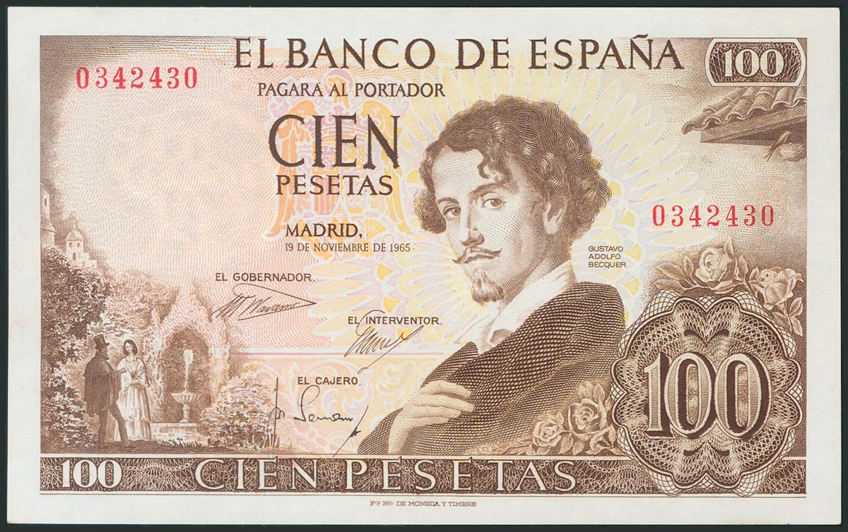 100 Pesetas. 19 de Noviembre de 1965. Sin serie y numeración capicúa 0342430. (Edifil 2017: 470). SC-.