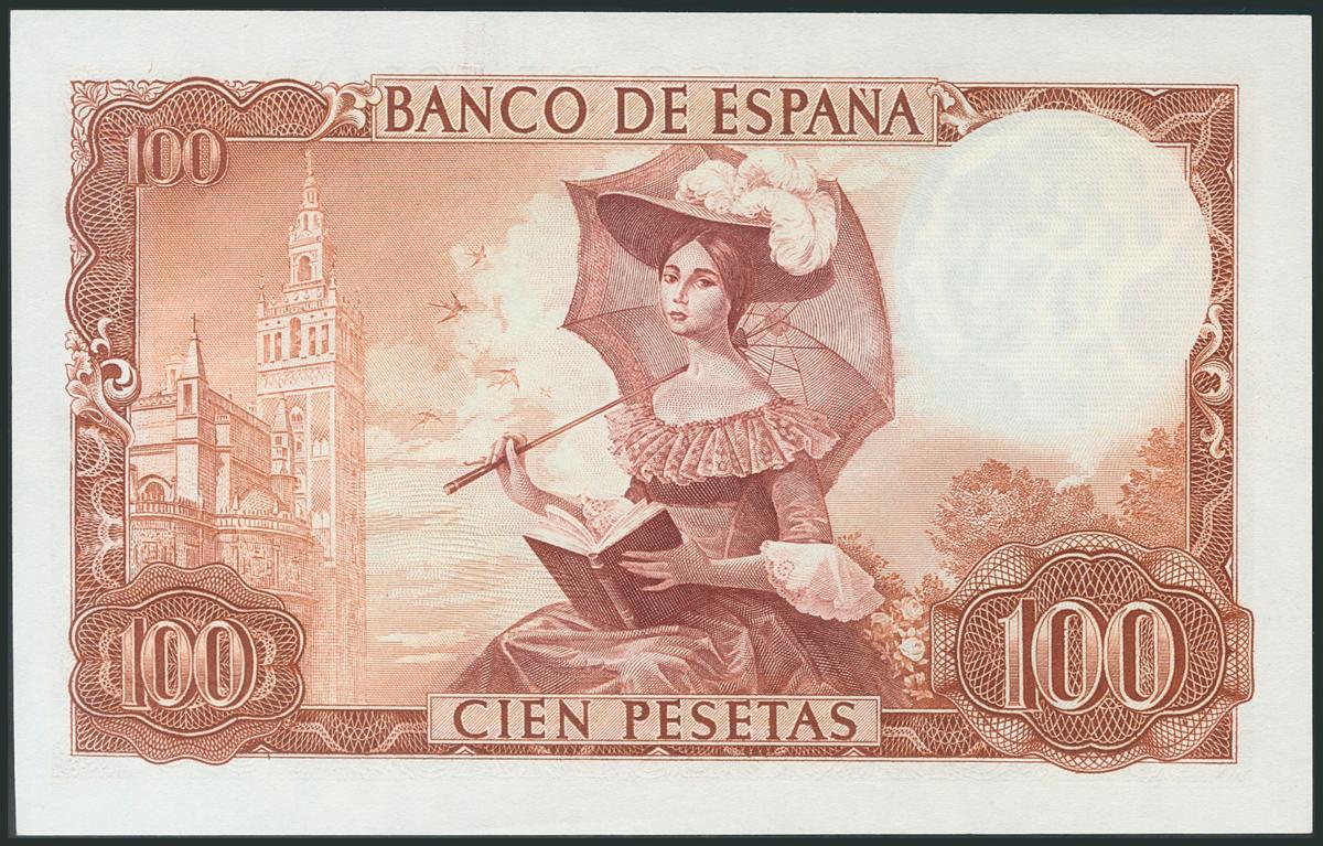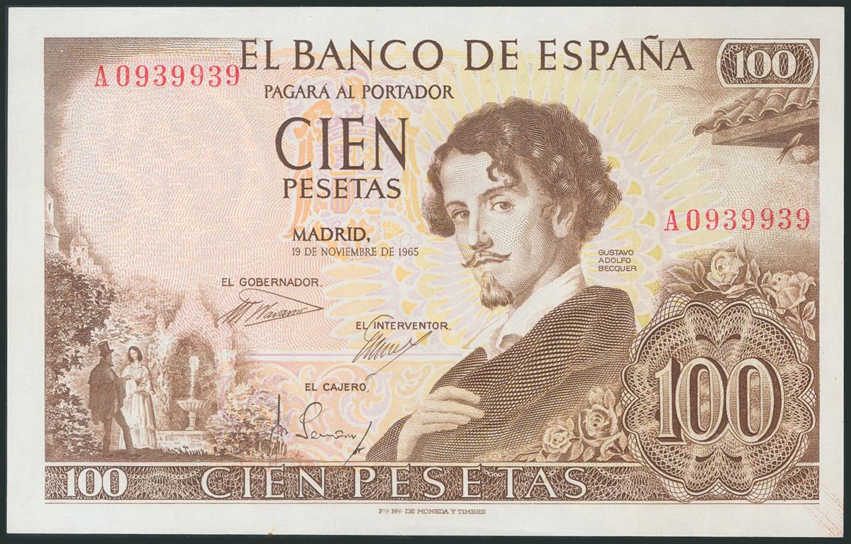 100 Pesetas. 19 de Noviembre de 1965. Serie A y numeración capicúa imperfecto A0939939. (Edifil 2017: 470a). SC.