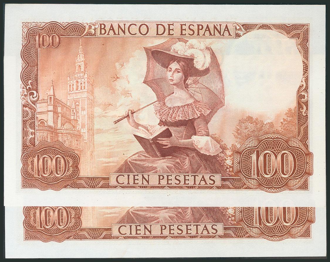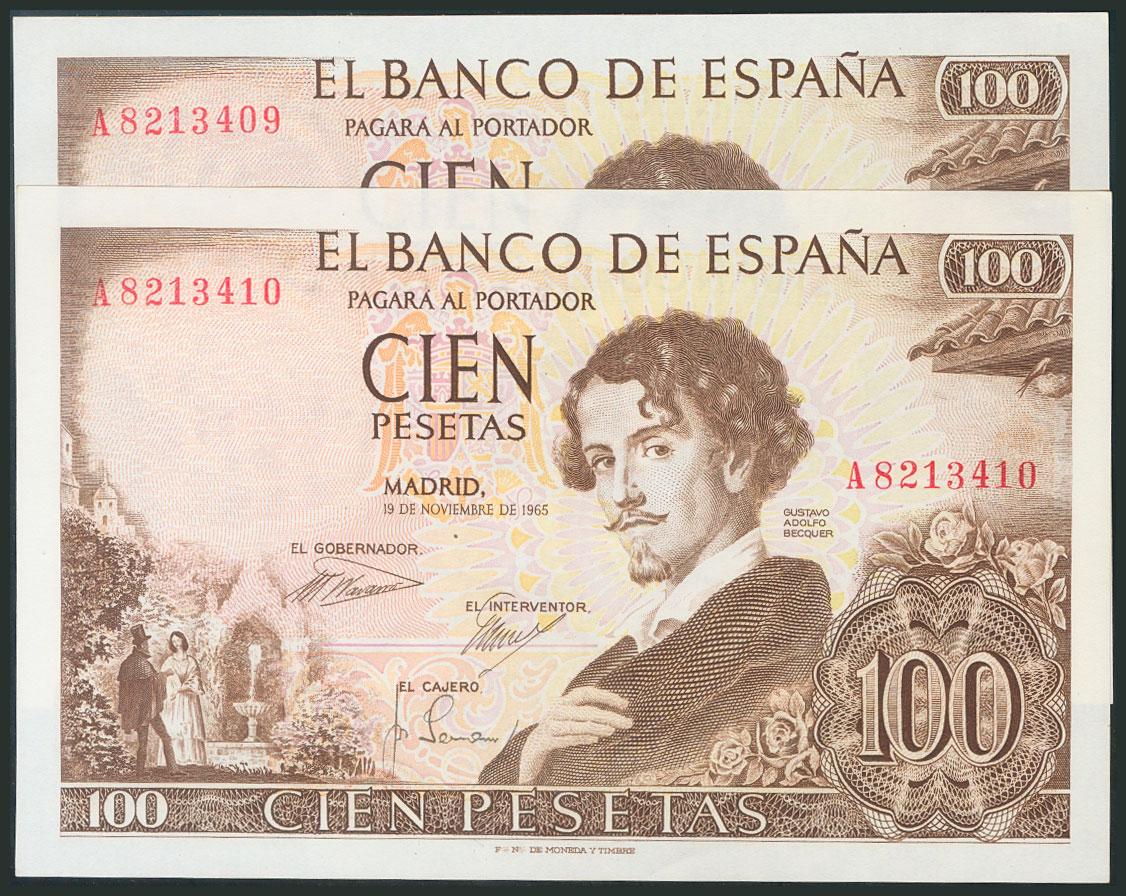 100 Pesetas. 19 de Noviembre de 1965. Pareja correlativa. Serie A. (Edifil 2017: 470a). SC-.