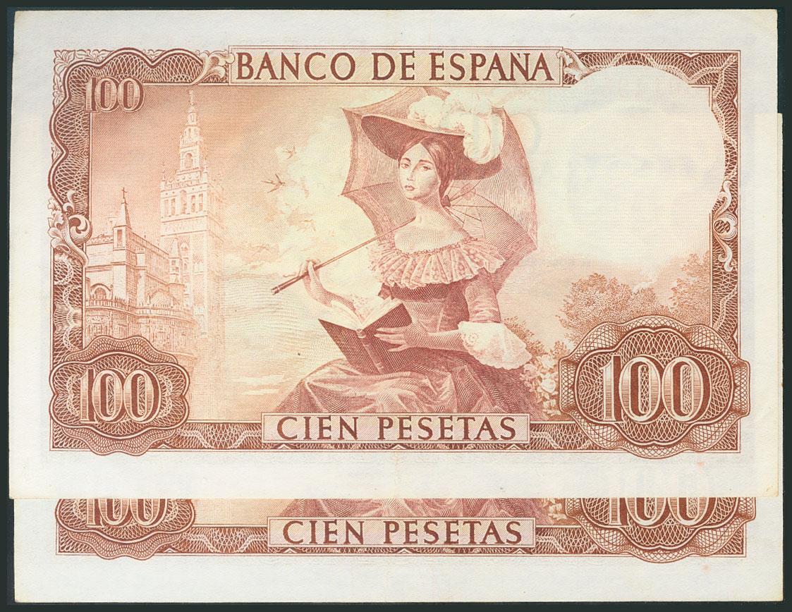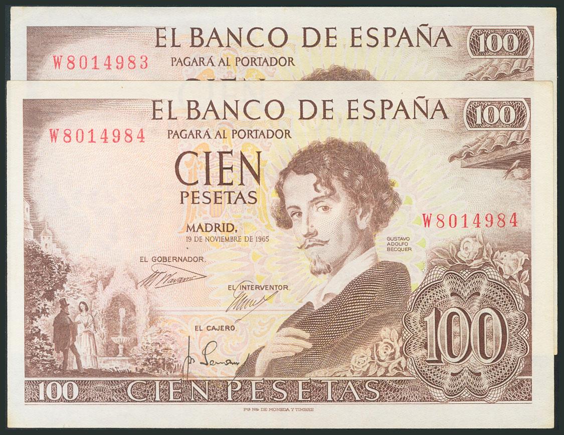 100 Pesetas. 19 de Noviembre de 1965. Pareja correlativa. Serie W. (Edifil 2017: 470a). EBC.