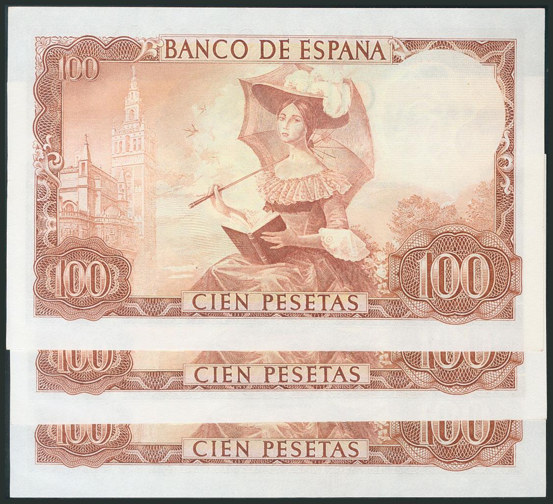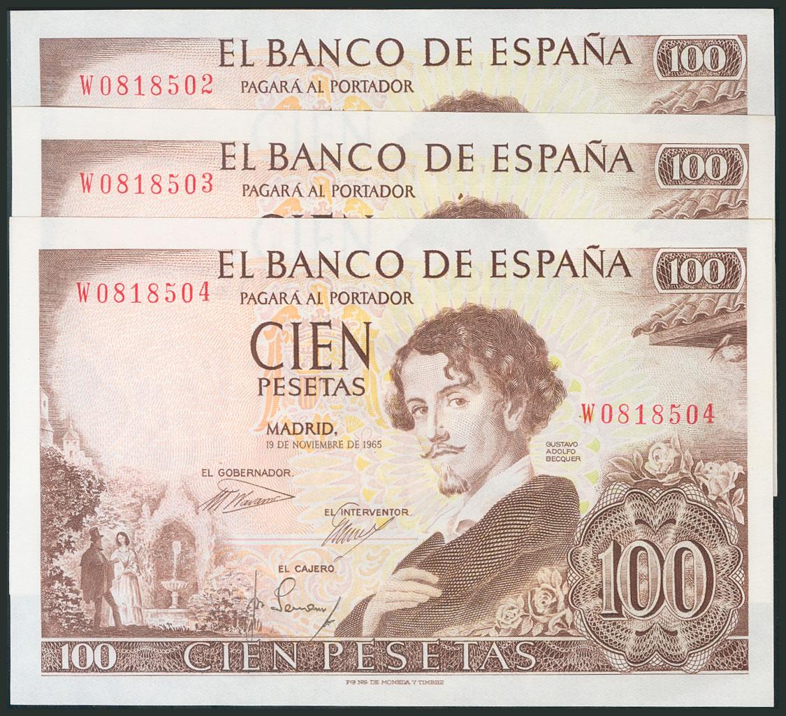 100 Pesetas. 19 de Noviembre de 1965. Trío correlativo. Serie W. (Edifil 2017: 470a). SC-.