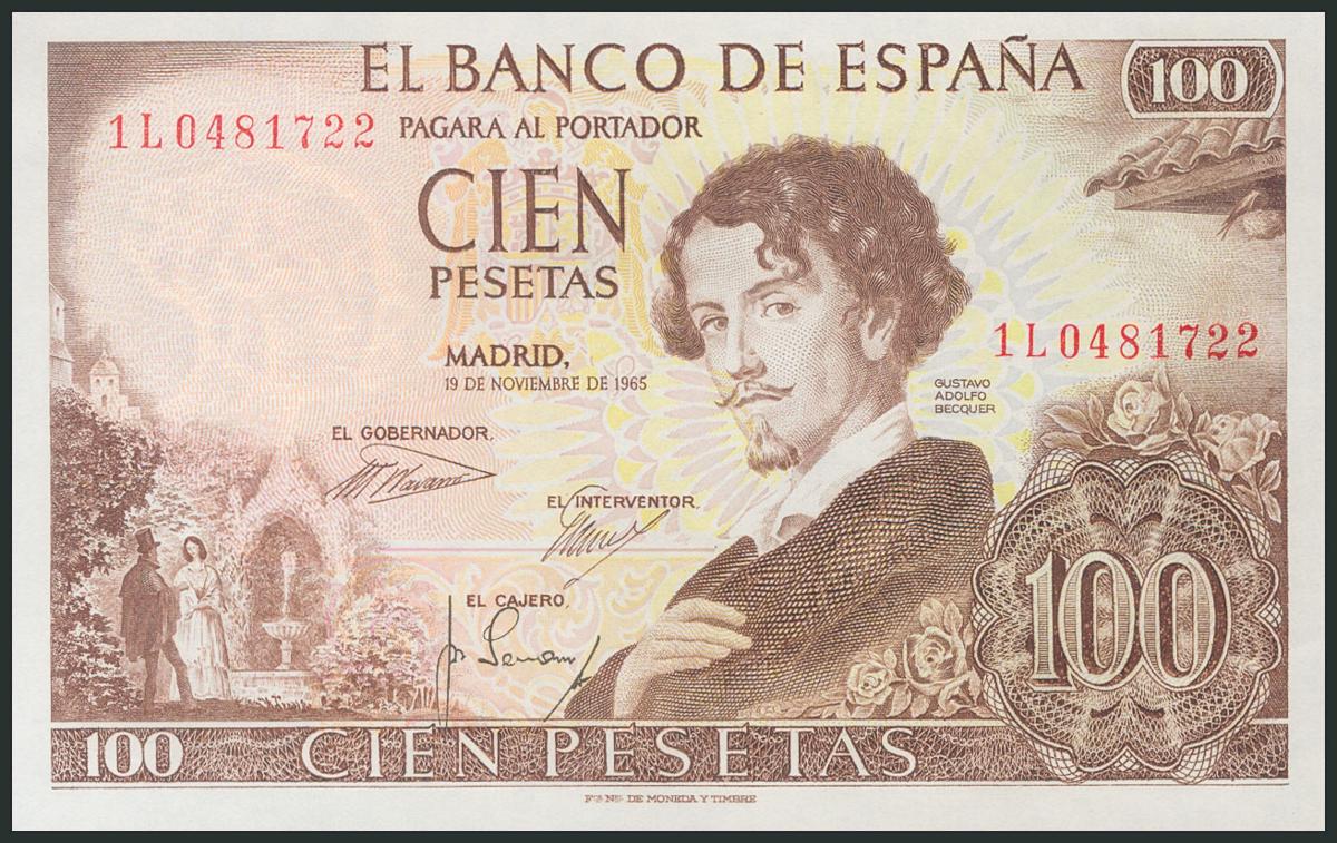 100 Pesetas. 19 de Noviembre de 1965. Serie 1L. (Edifil 2017: 470a). SC.