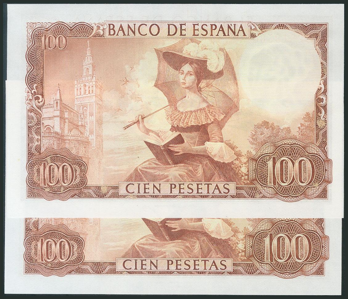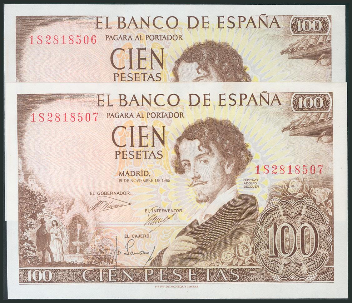 100 Pesetas. 19 de Noviembre de 1965. Pareja correlativa. Serie 1S. (Edifil 2017: 470a). SC-.