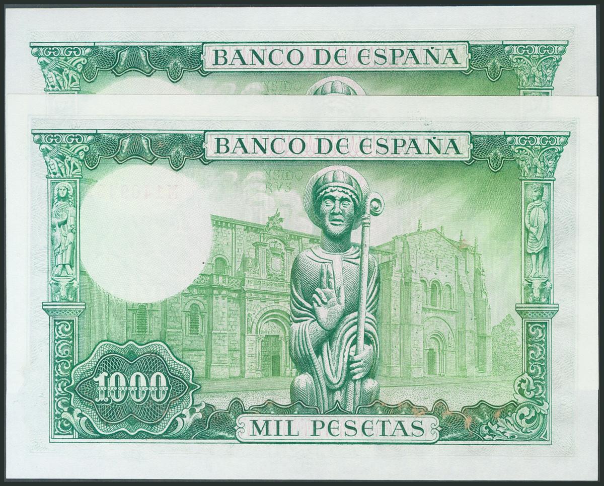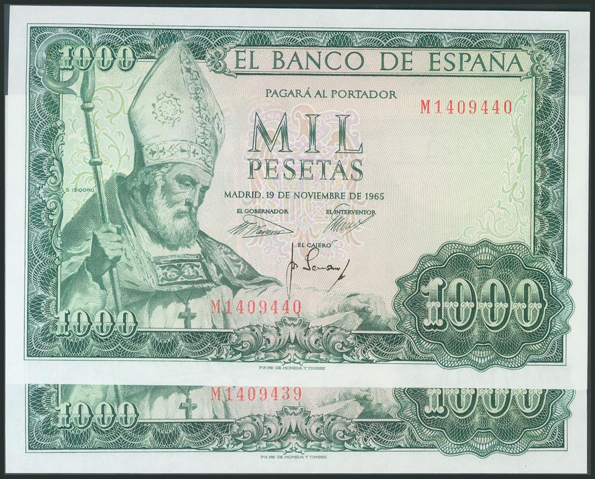 1000 Pesetas. 19 de Noviembre de 1965. Pareja correlativa. Serie M. (Edifil 2017: 471b). Conserva todo su apresto original. SC-.
