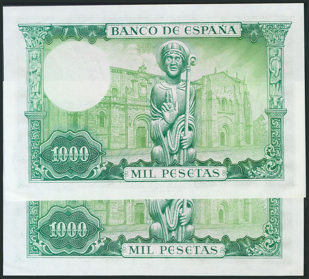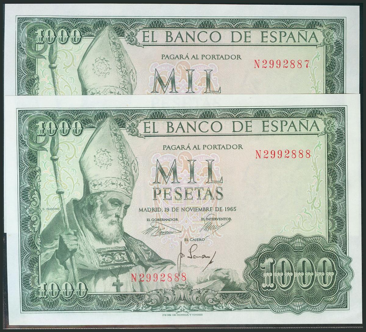 1000 Pesetas. 19 de Noviembre de 1965. Pareja correlativa. Serie N. (Edifil 2017: 471b). Apresto original, esquina mínimamente marcada. SC-.