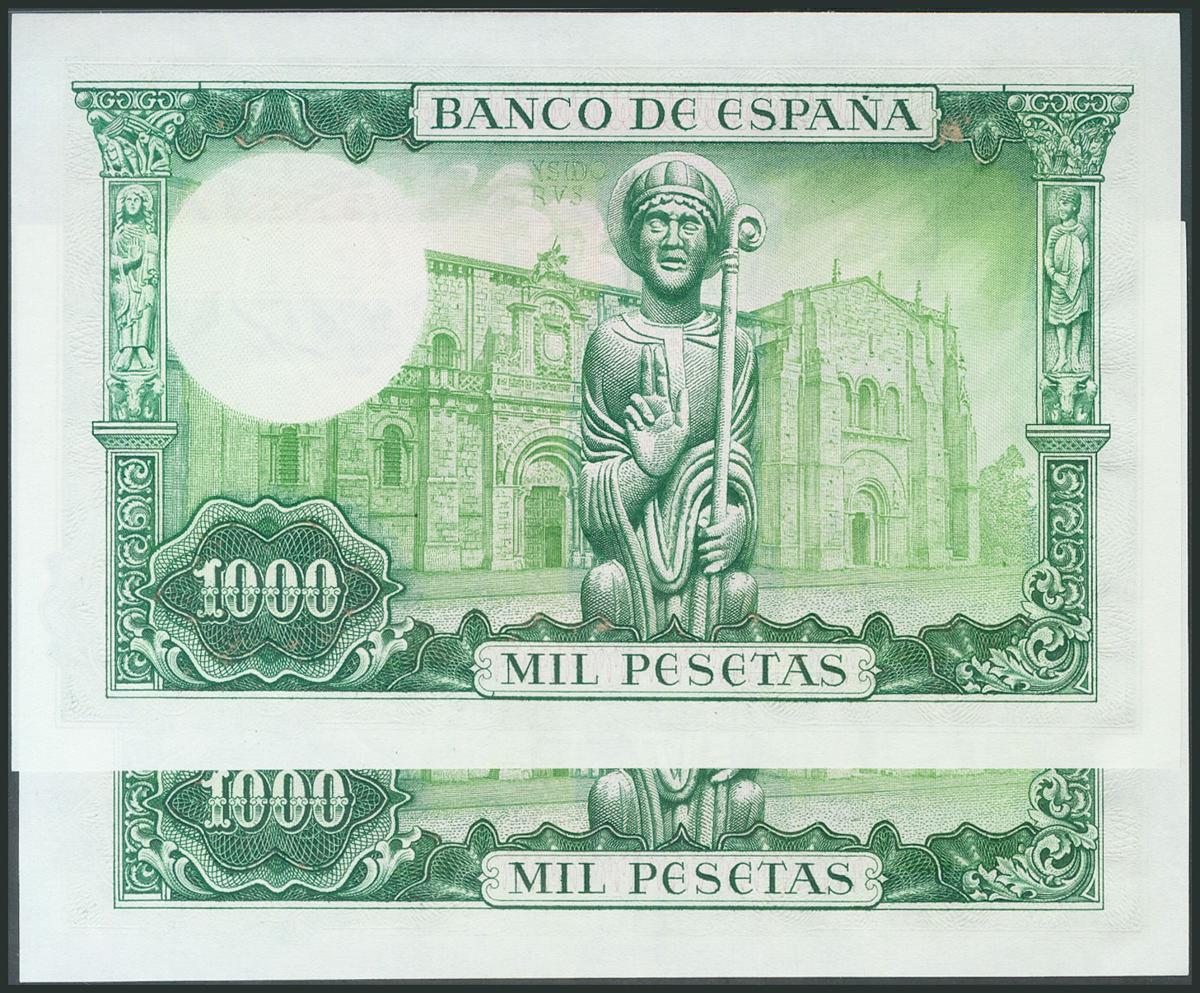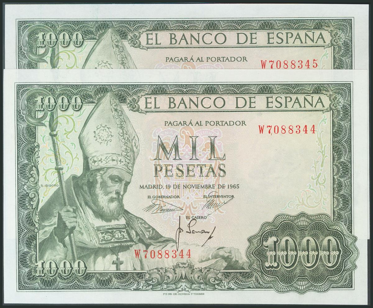1000 Pesetas. 19 de Noviembre de 1965. Pareja correlativa. Serie W. (Edifil 2017: 471b). Uno de los billetes tiene una machita original de impresión. SC/SC-.
