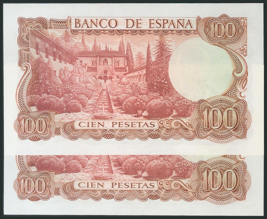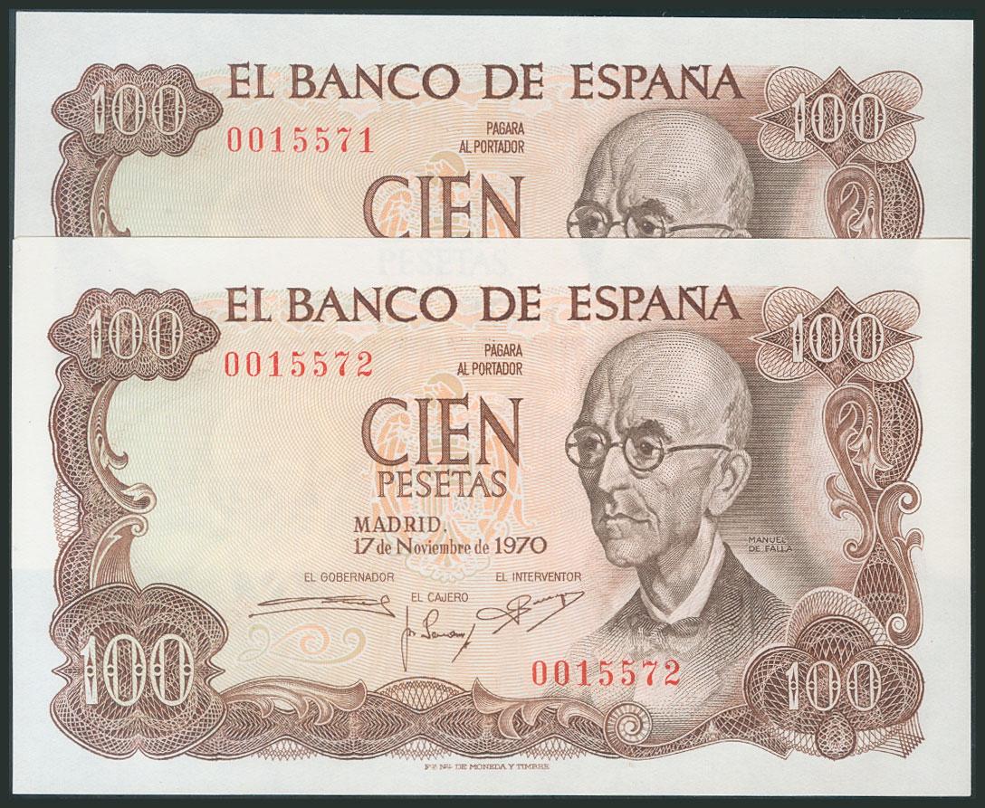 100 Pesetas. 17 de Noviembre de 1970. Pareja correlativa. Sin serie y numeración baja. (Edifil 2017: 472). SC.