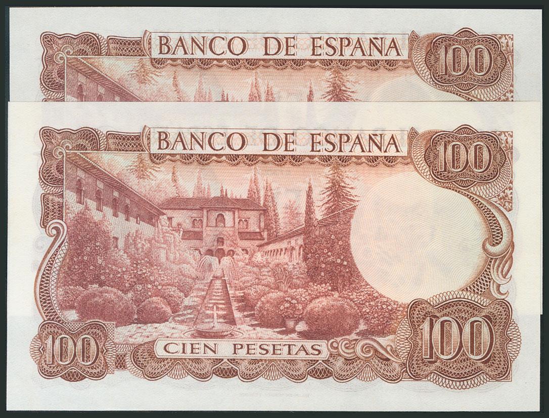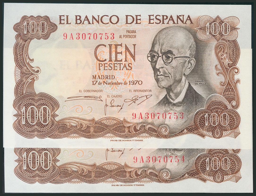 100 Pesetas. 17 de Noviembre de 1970. Pareja correlativa. Serie 9A, numeración especial. (Edifil 2017: 472d). SC.