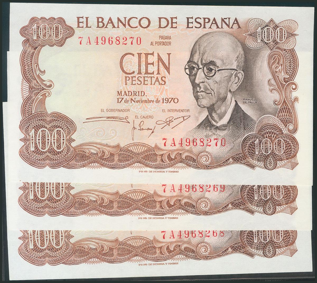 100 Pesetas. 17 de Noviembre de 1970. Trío correlativo. Serie 7A. (Edifil 2017: 472c). EBC-.
