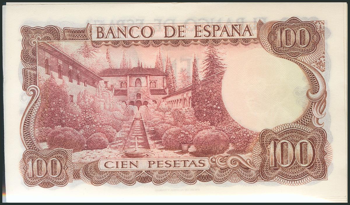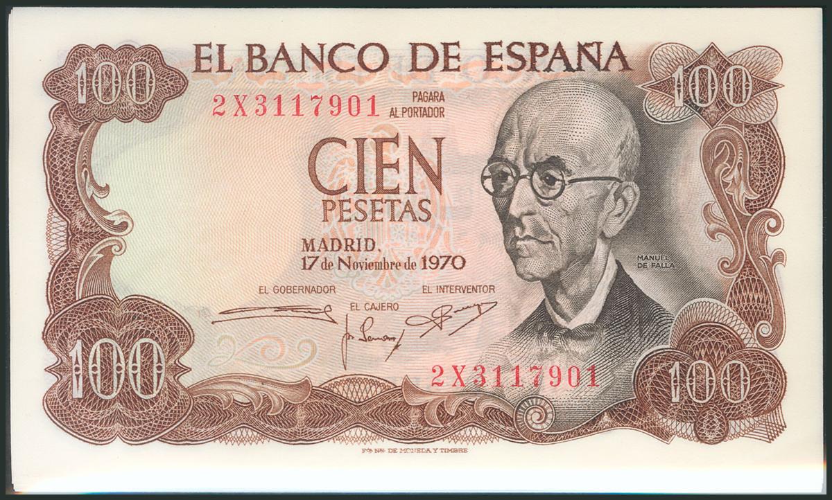 Conjunto de 100 billetes ("fajo" sin conservar el precinto) de 100 Pesetas emitidos el 17 de Noviembre de 1970 y de la serie 2X (Edifil 2017: 472c). SC/SC-.