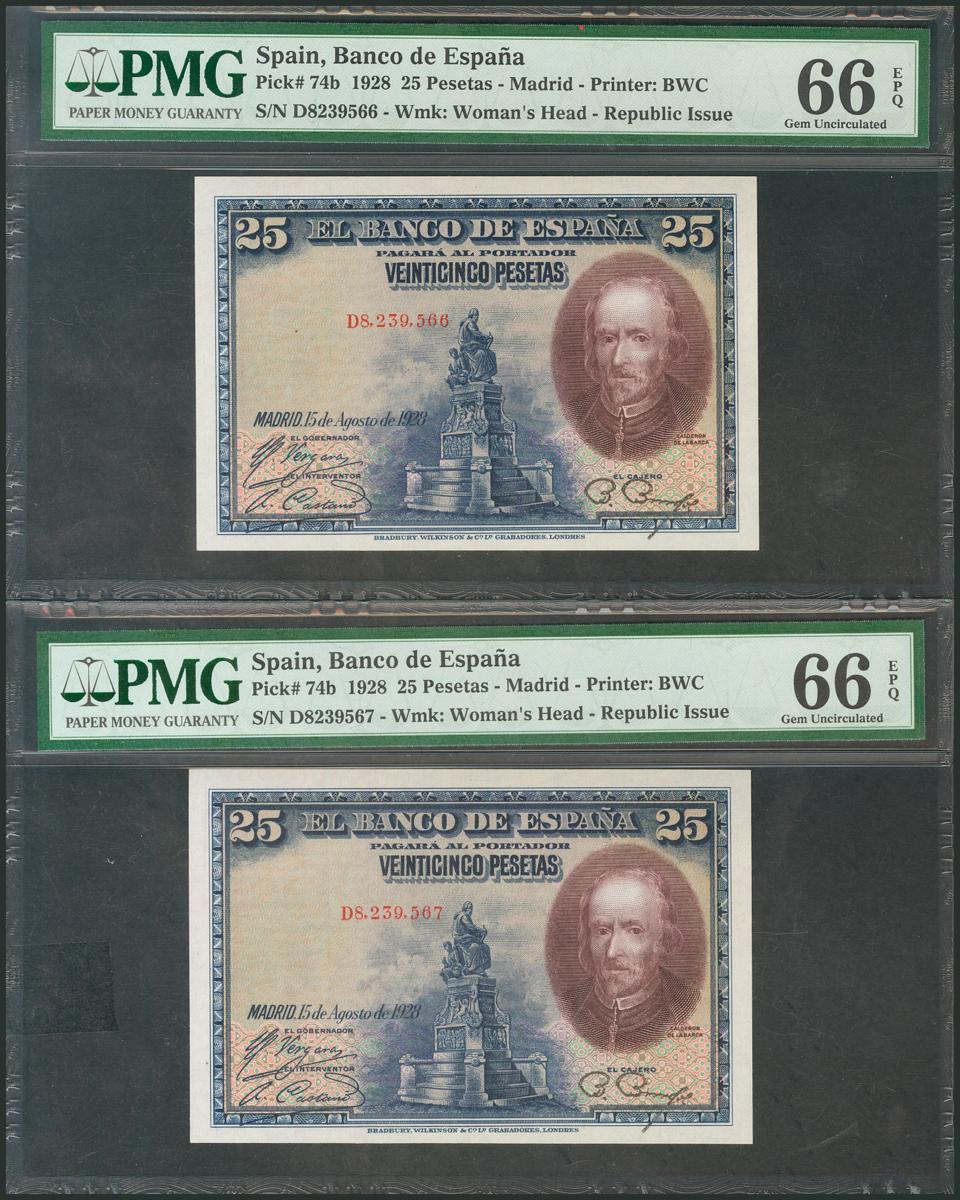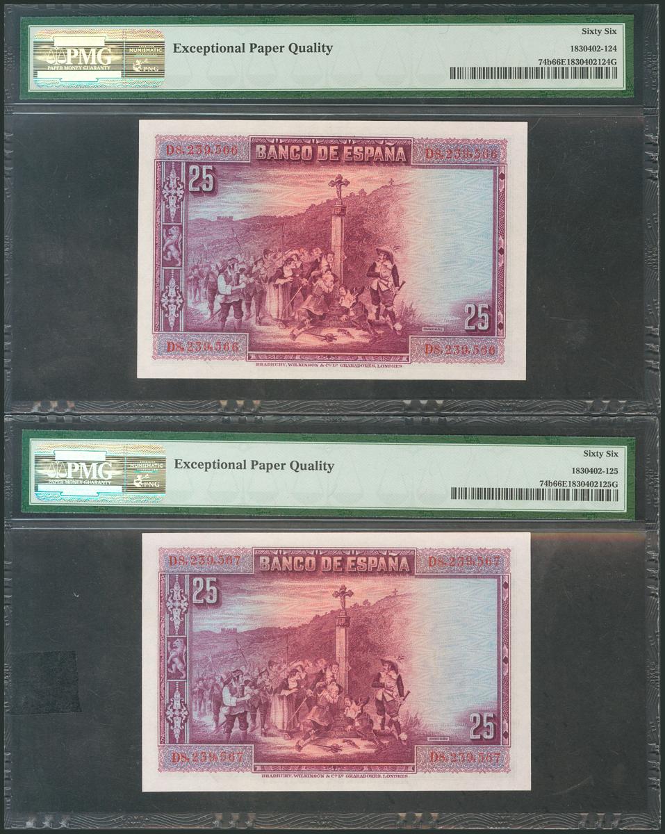 25 Pesetas. 15 de Agosto de 1928. Pareja correlativa. Serie D. (Edifil 2017: 353). Encapsulados PMG66EPQ, ambos. SC.