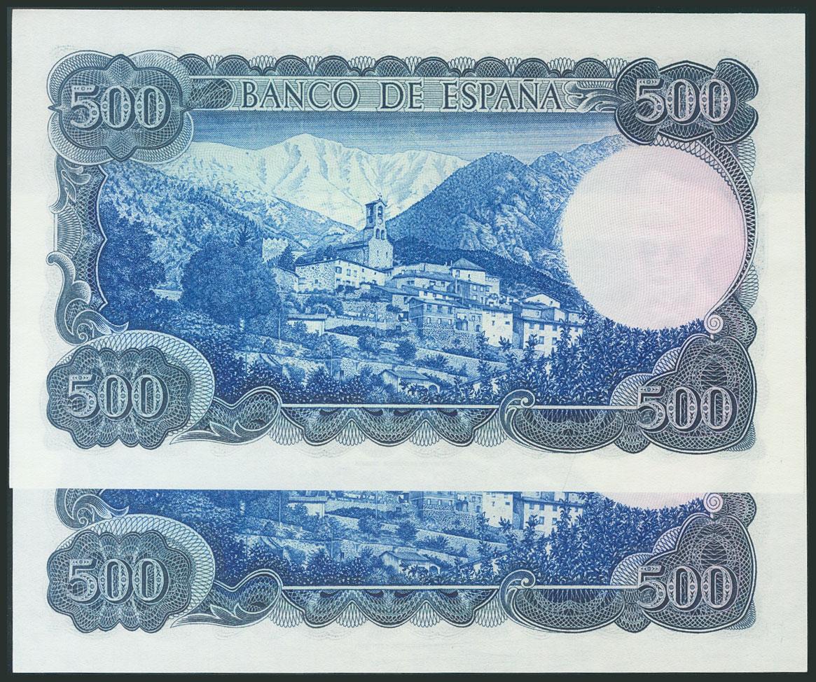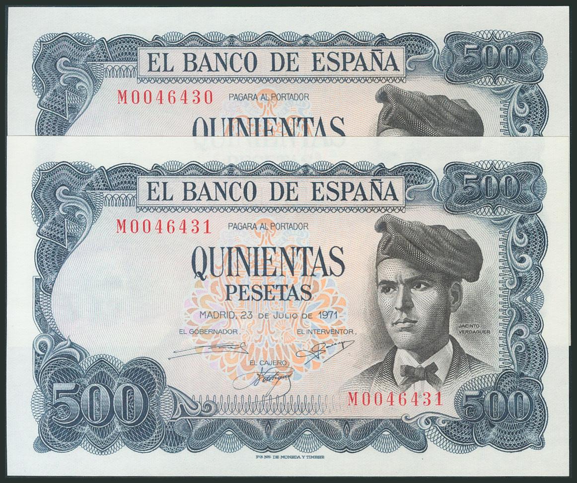500 Pesetas. 23 de Junio de 1971. Pareja correlativa. Serie M. (Edifil 2017: 473a). SC.