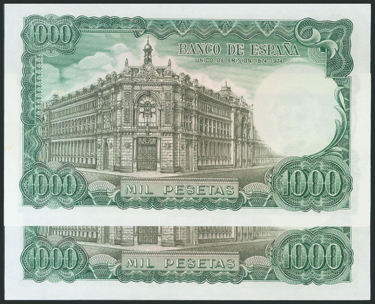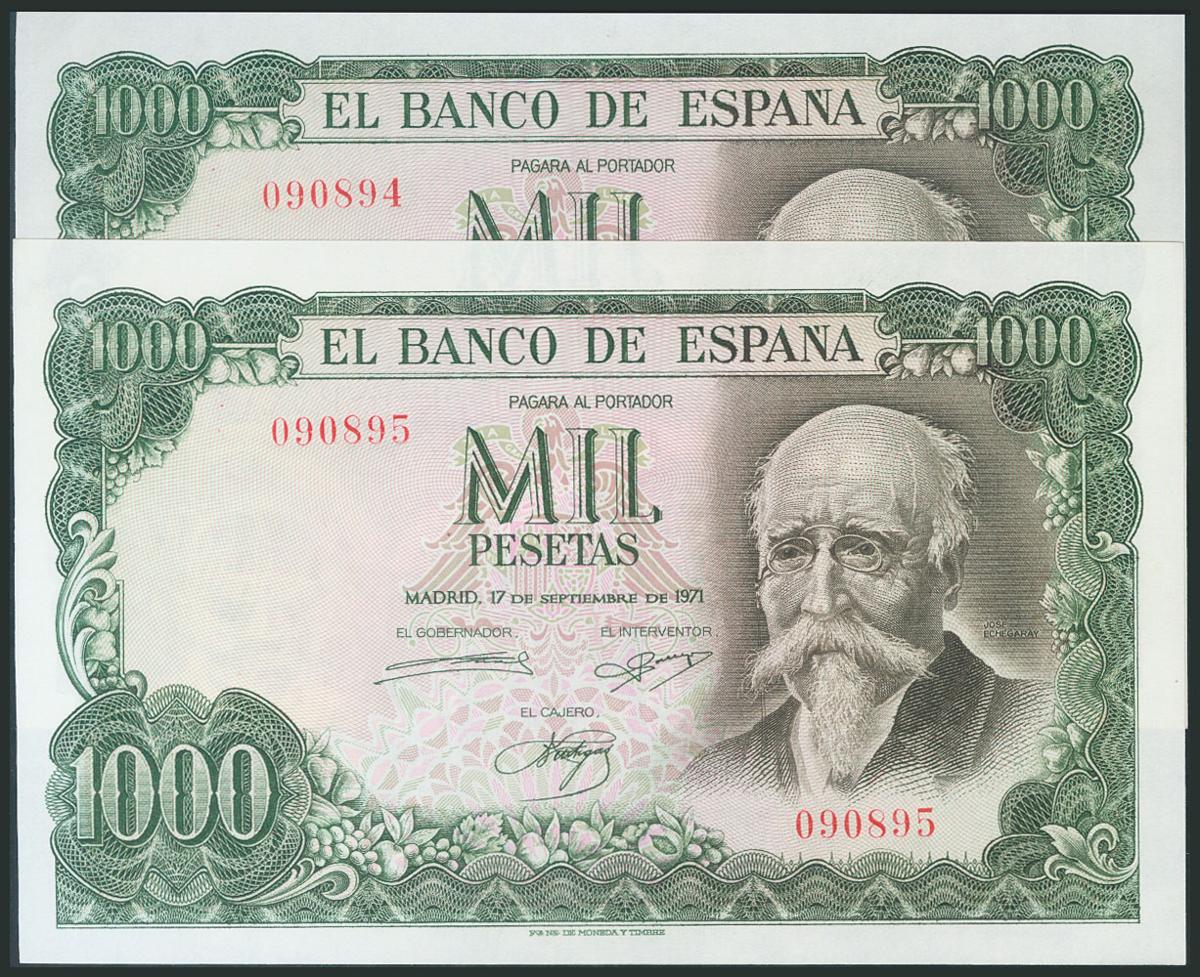 1000 Pesetas. 17 de Septiembre de 1971. Pareja correlativa. Sin serie. (Edifil 2017: 474). Conserva todo su apresto original. EBC++.