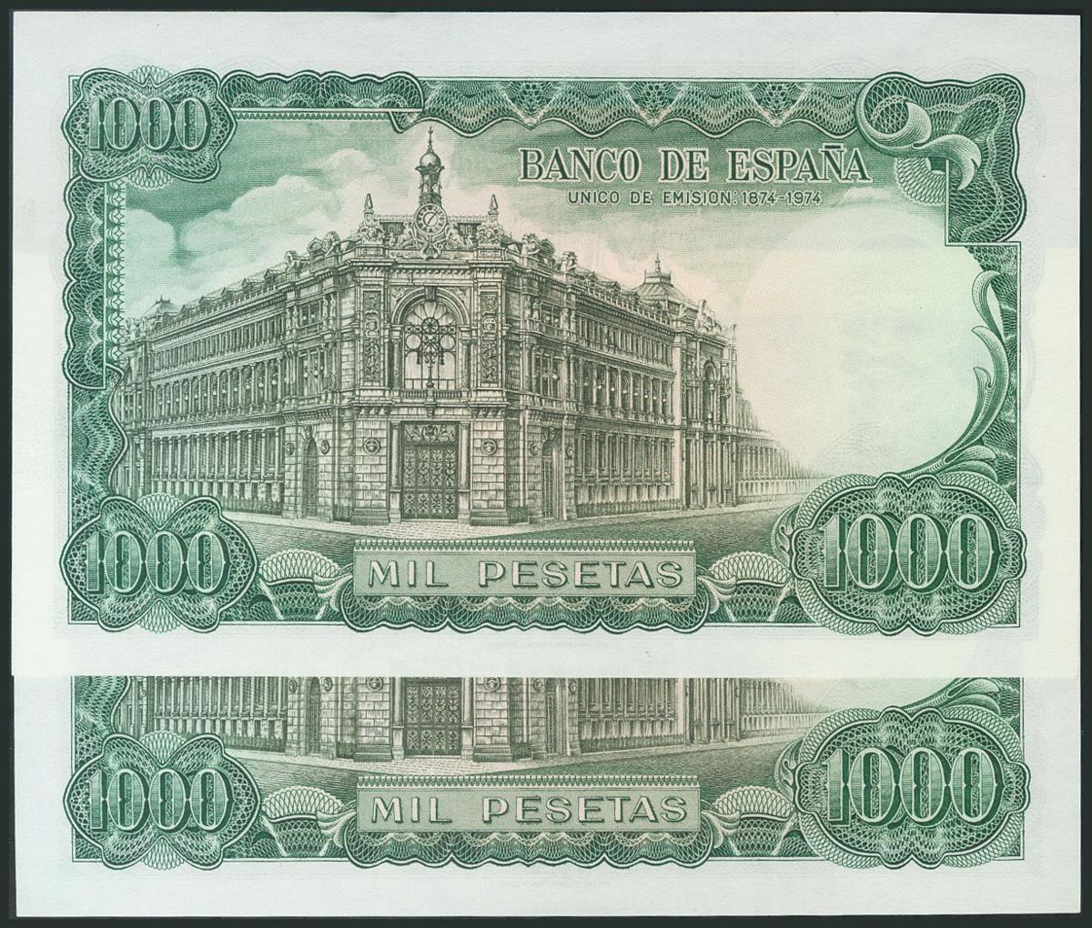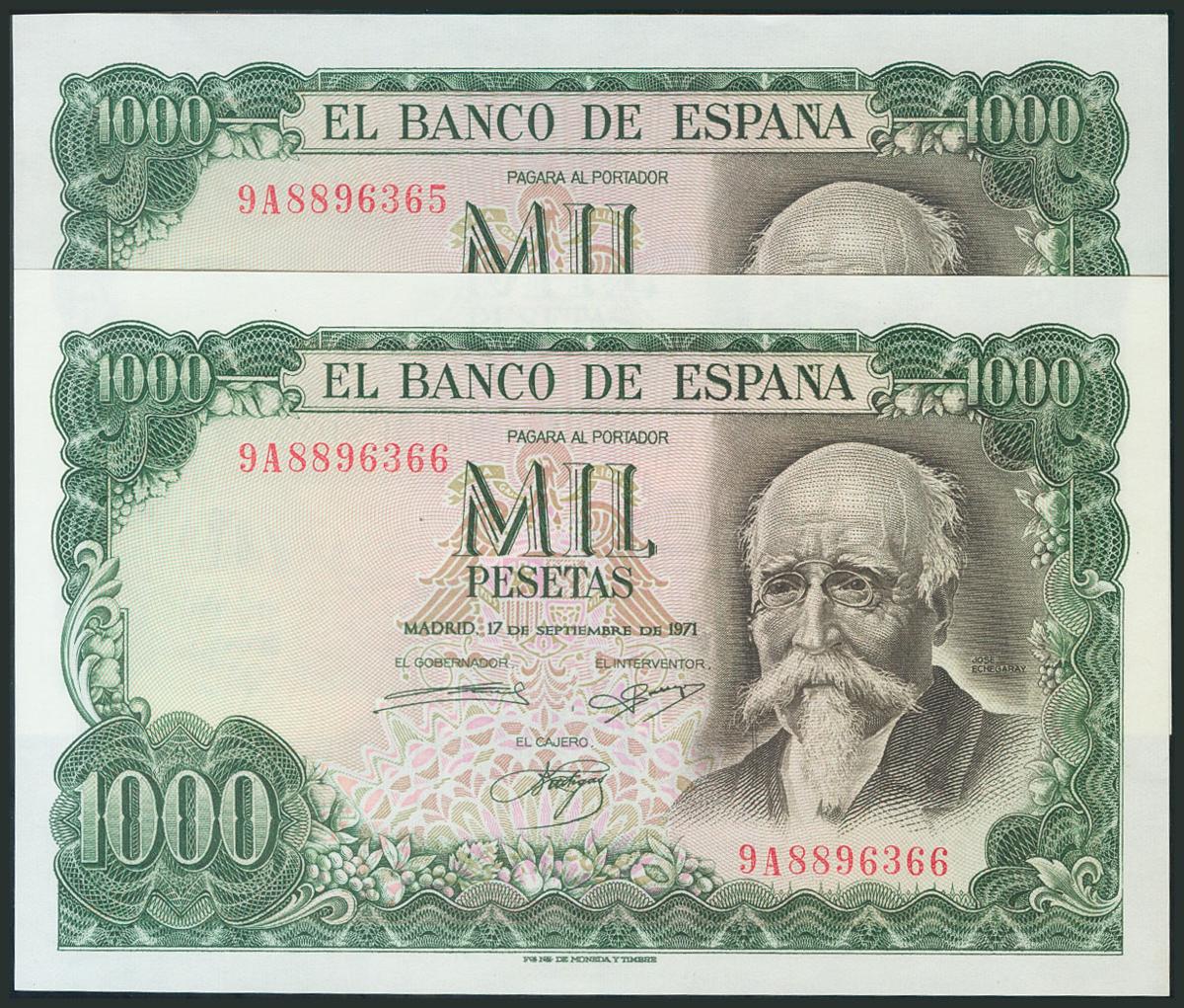 1000 Pesetas. 17 de Septiembre de 1971. Pareja correlativa. Serie 9A, serie especial. (Edifil 2017: 474d). SC-.