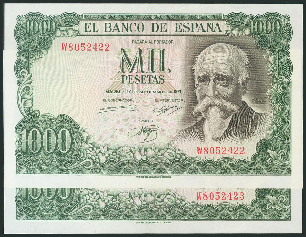 1000 Pesetas. 17 de Septiembre de 1971. Pareja correlativa. Serie W. (Edifil 2017: 474b). SC.
