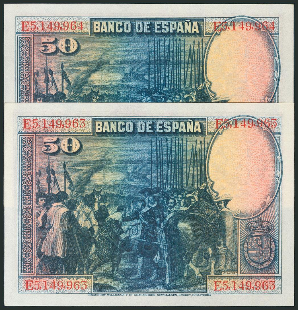 50 Pesetas. 15 de Agosto de 1925. Pareja correlativa. Serie E. (Edifil 2017: 354). SC-.