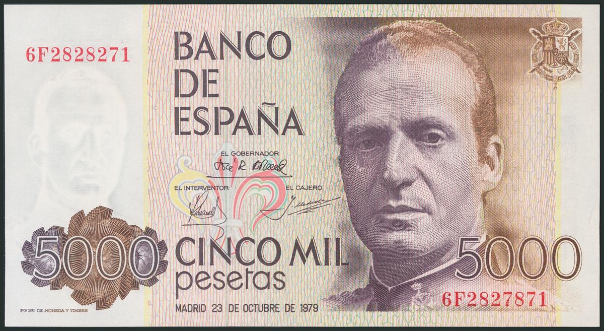 5000 Pesetas. 23 de Octubre de 1979. Serie 6F y error de numeración (no coinciden las dos numeraciones del billete)(Edifil 2017: 478a). Raro. SC-.
