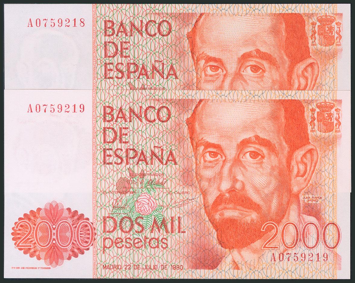 2000 Pesetas. 22 de Julio de 1980. Pareja correlativa. Serie A. (Edifil 2017: 479a). SC-.
