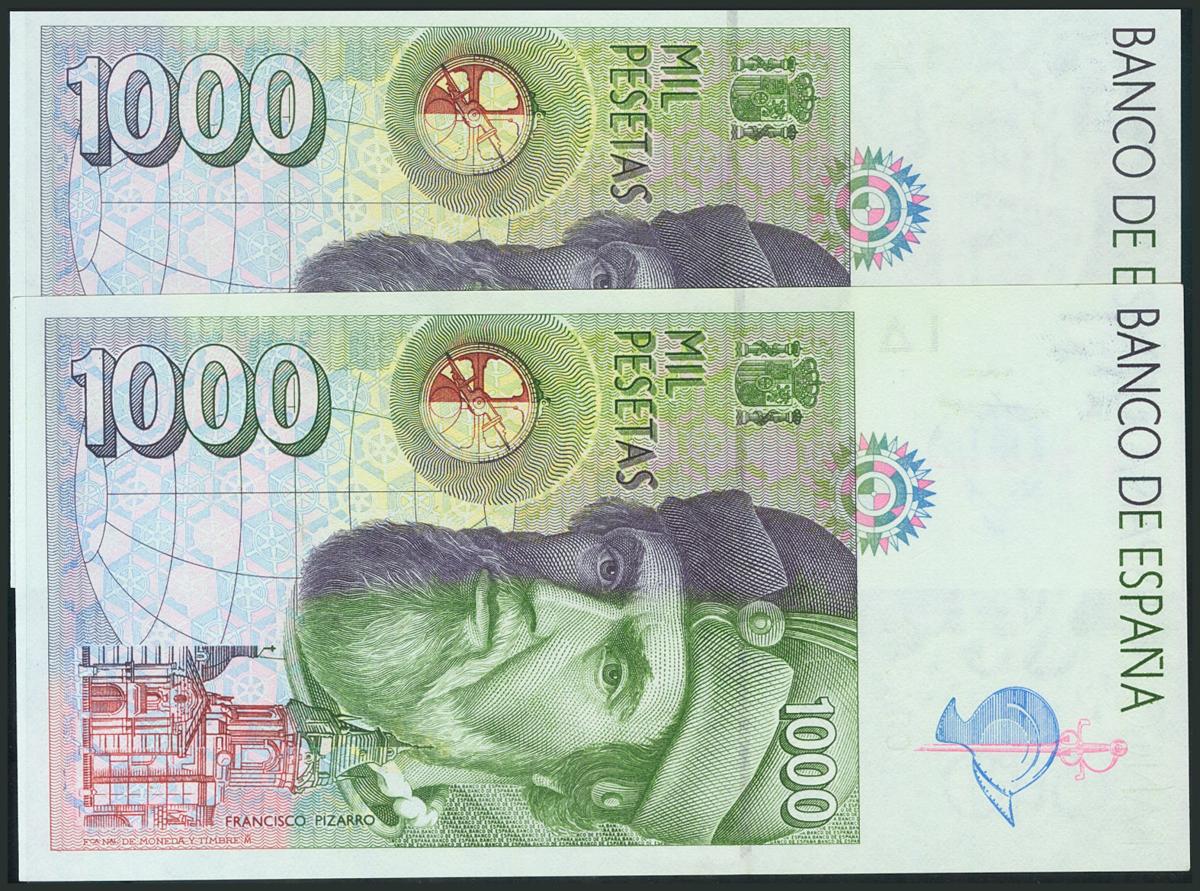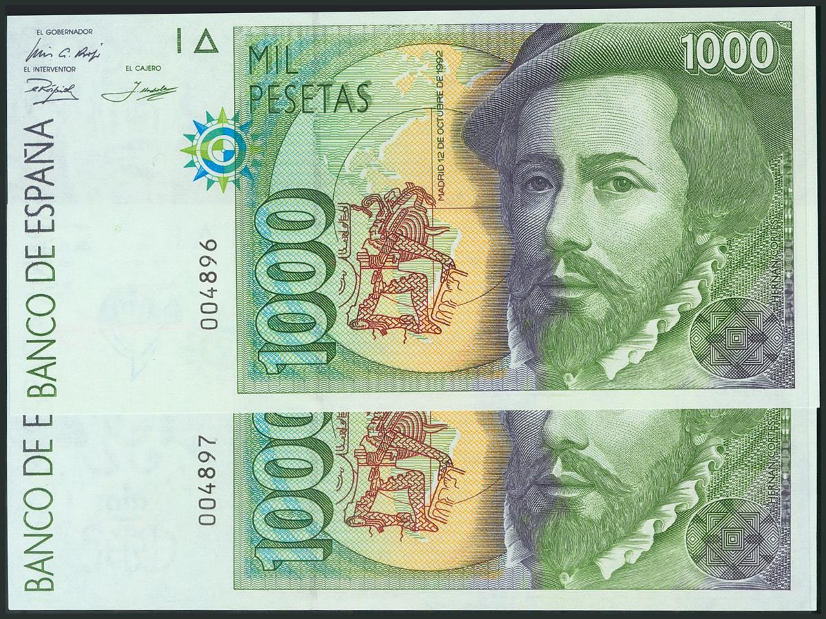 1000 Pesetas. 12 de Octubre de 1992. Pareja correlativa. Sin serie, Tipo I y numeración muy baja. (Edifil 2017: 483). SC.