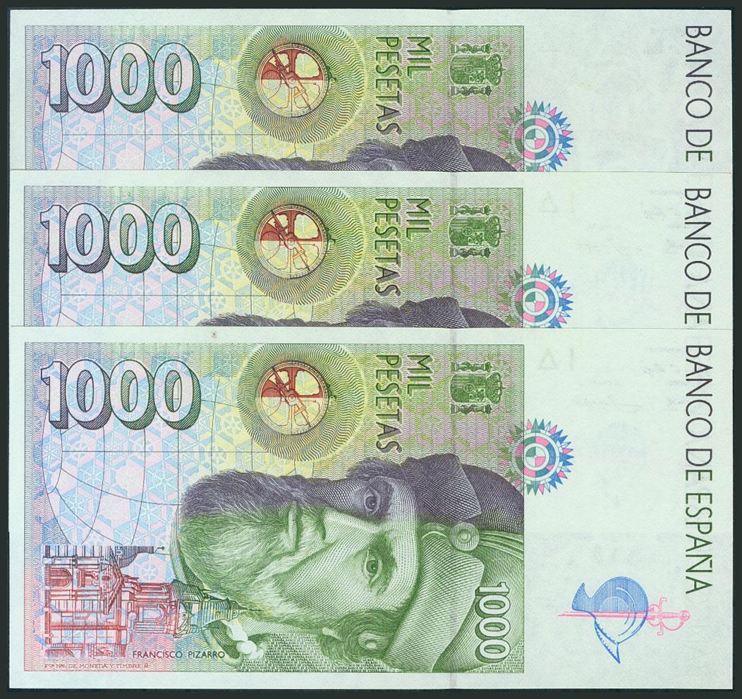 1000 Pesetas. 12 de Octubre de 1992. Trío correlativo. Sin serie, Tipo I y numeración muy baja. (Edifil 2017: 483). SC.