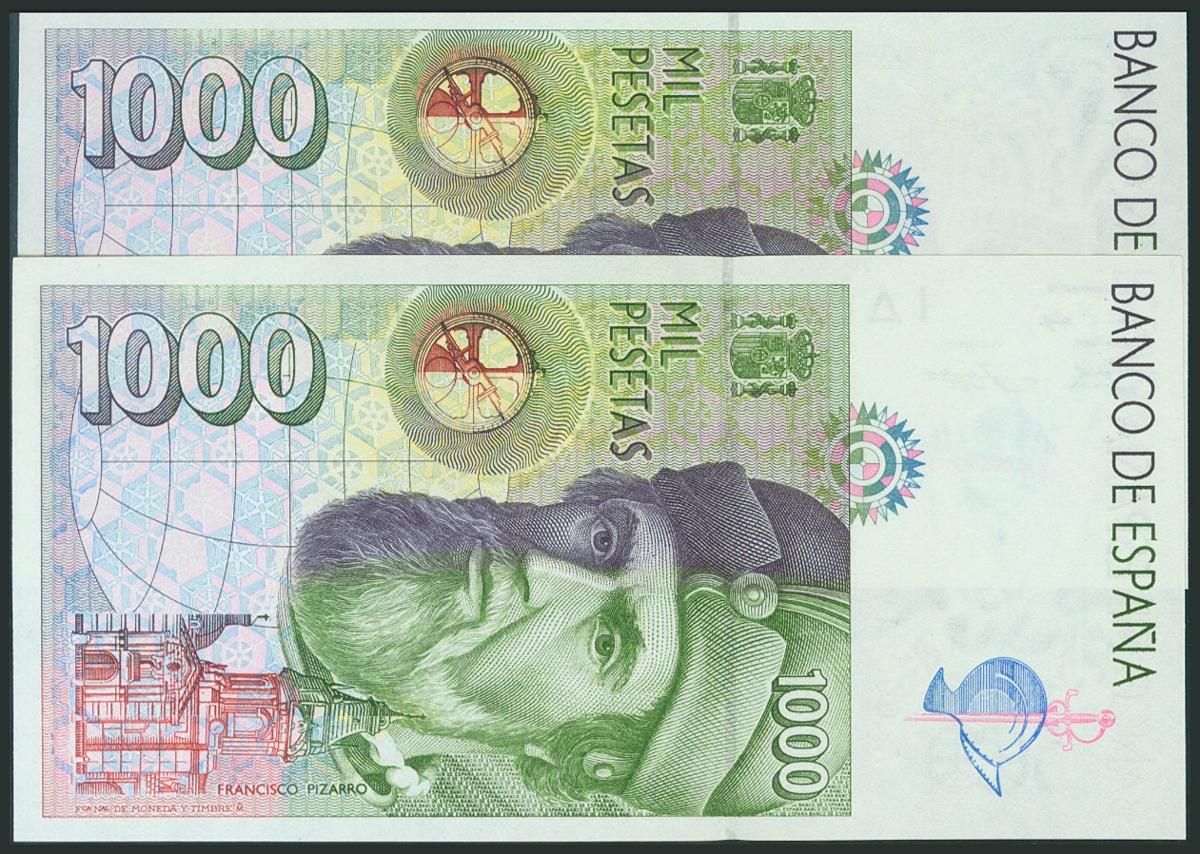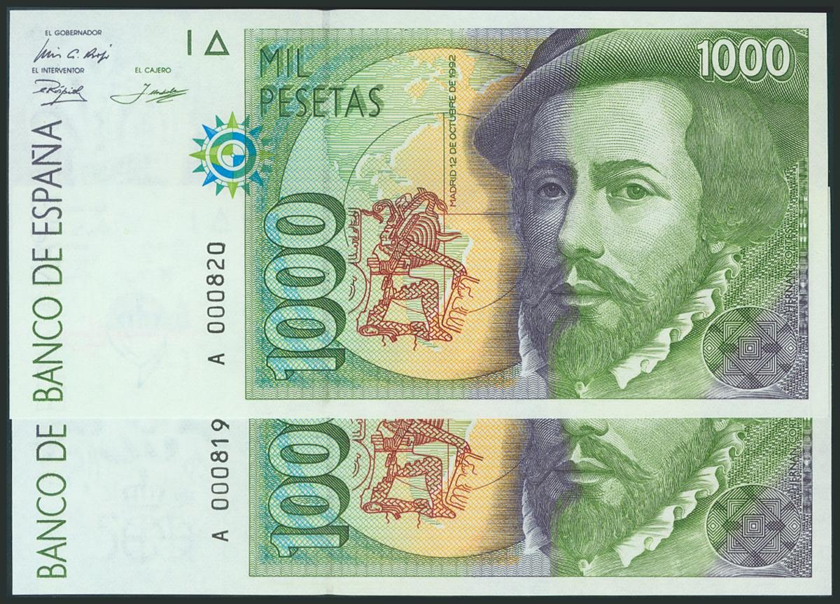 1000 Pesetas. 12 de Octubre de 1992. Pareja correlativa. Tipo I. Serie A y numeración muy baja. (Edifil 2017: 483a). SC.