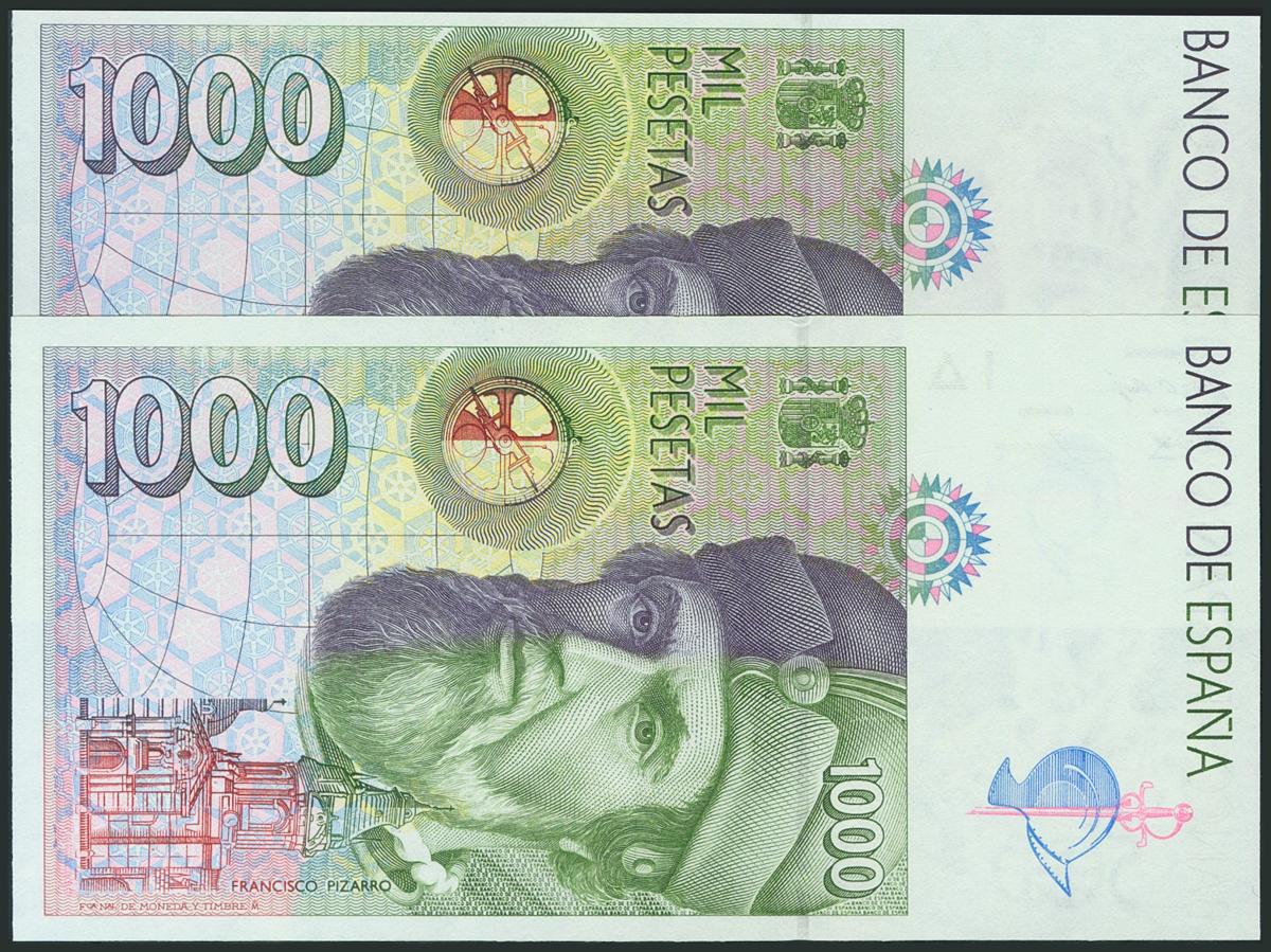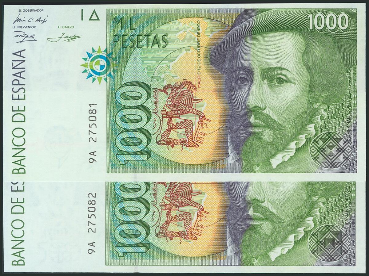 1000 Pesetas. 12 de Octubre de 1992. Pareja correlativa. Serie 9A, serie especial, Tipo I. (Edifil 2017: 483c). SC-.